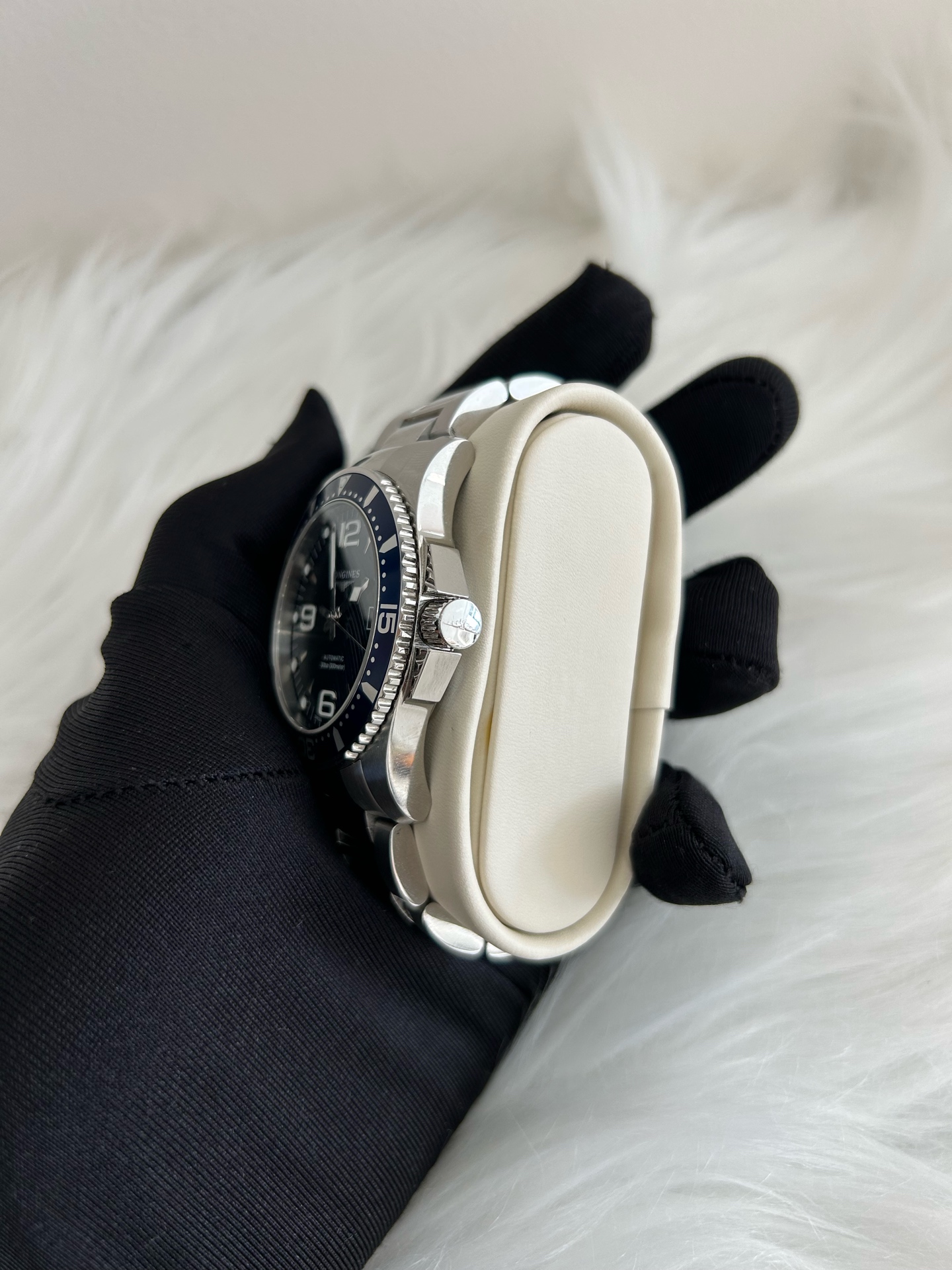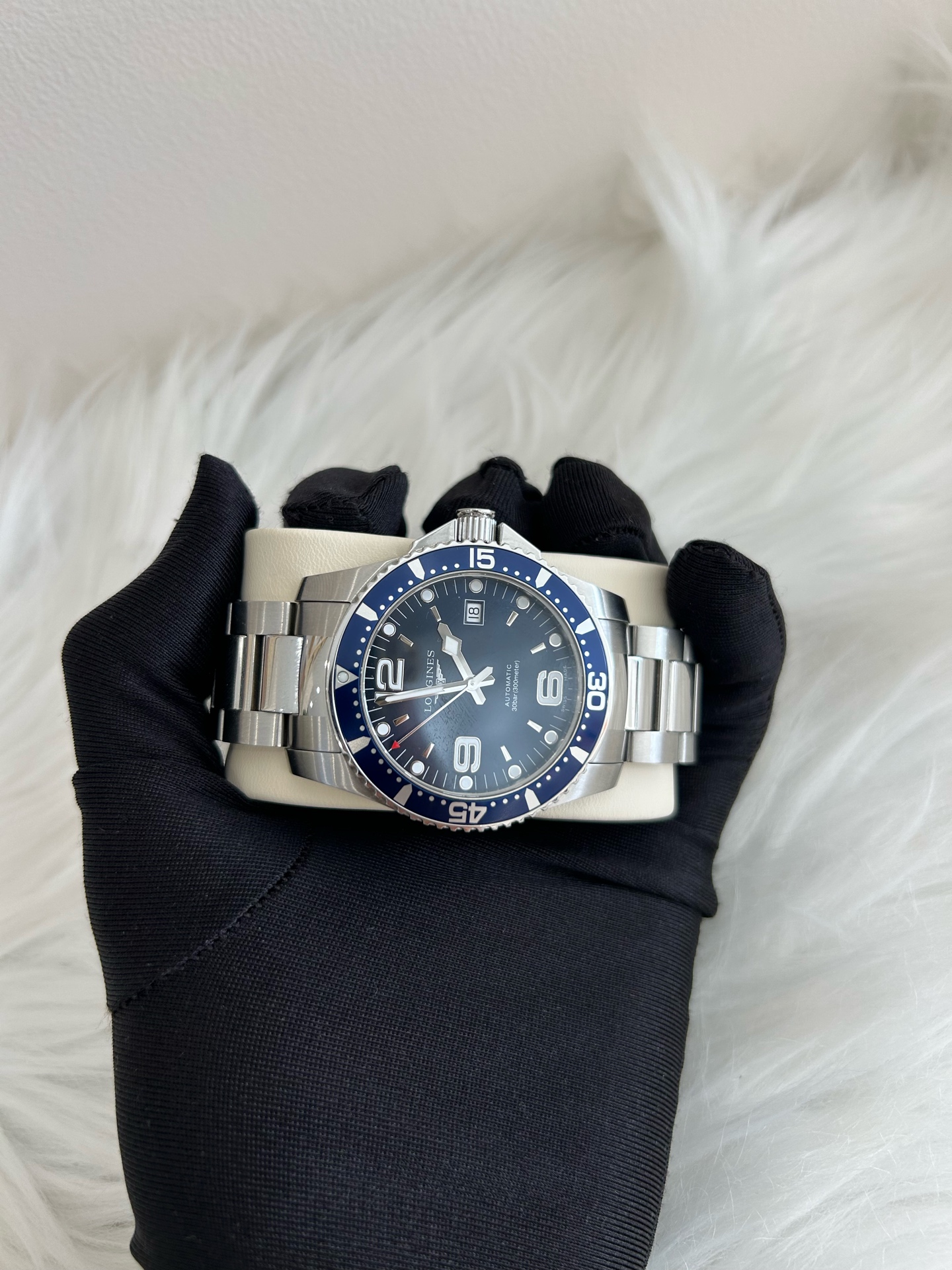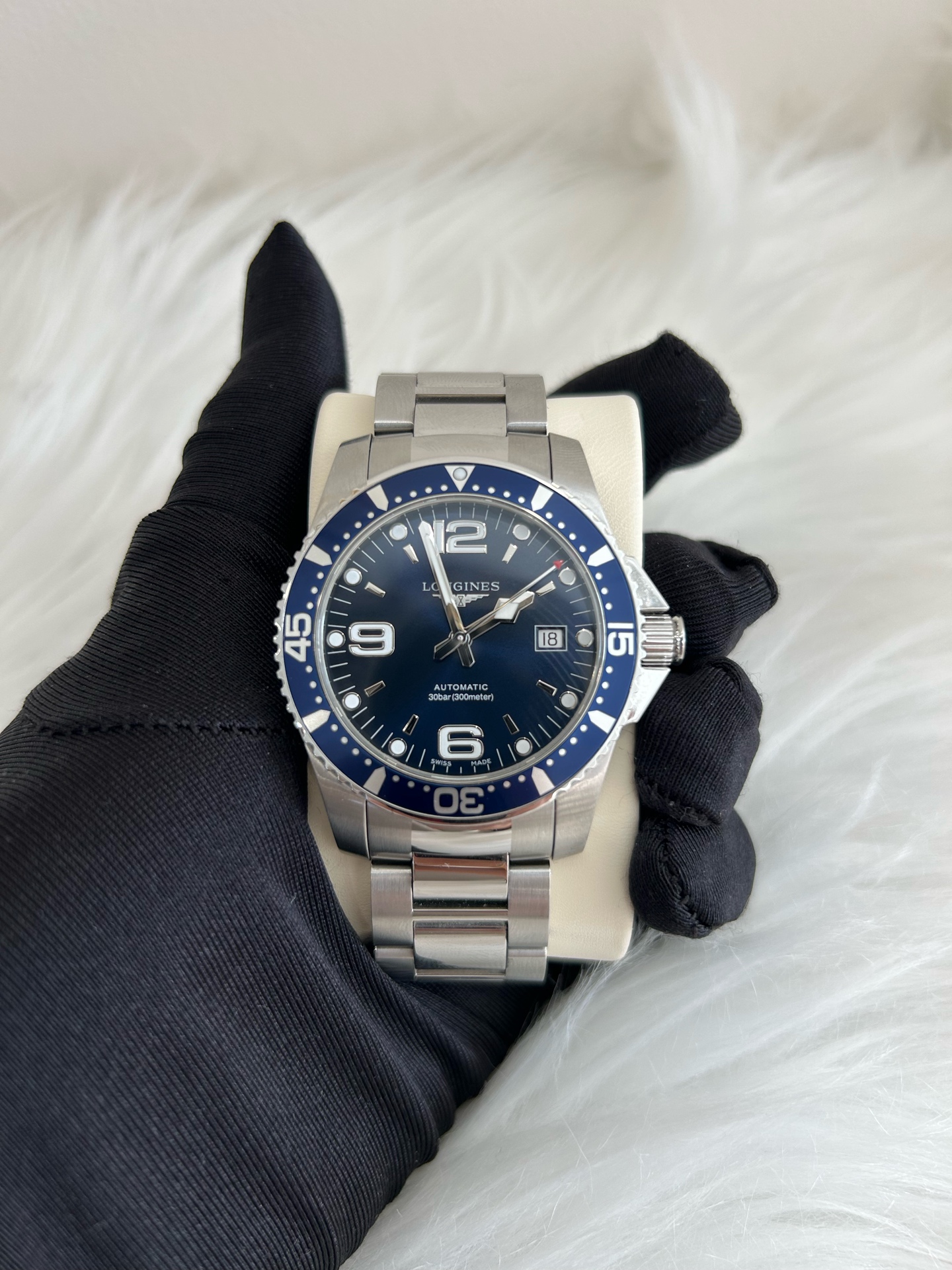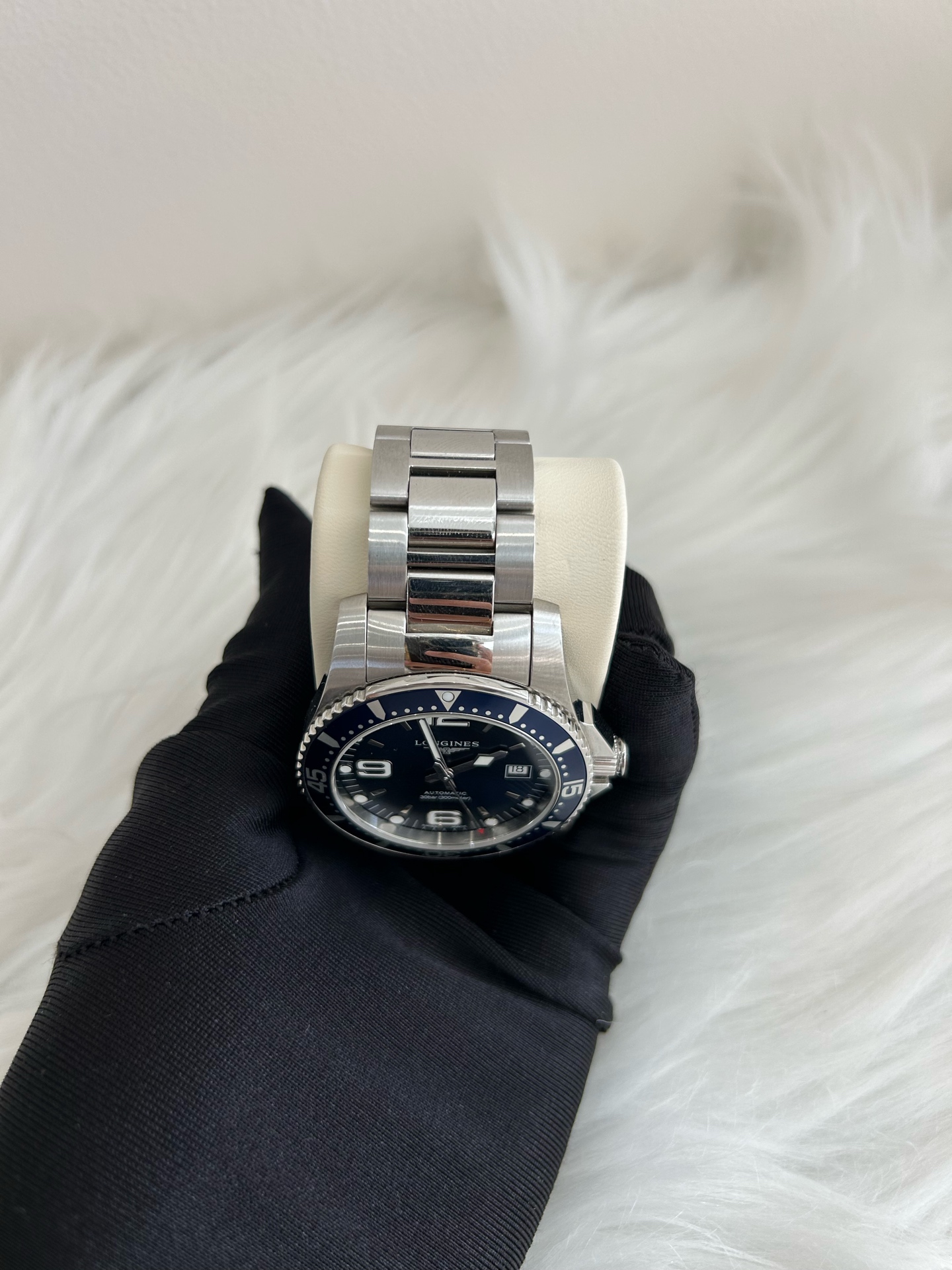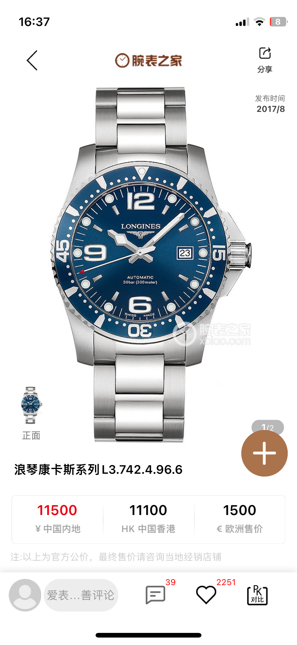 浪琴/Longines 康卡斯蓝色钢圈 潜水系列腕表 型号23.742.4.96.6 机械精钢 表径41 ,公价11500。