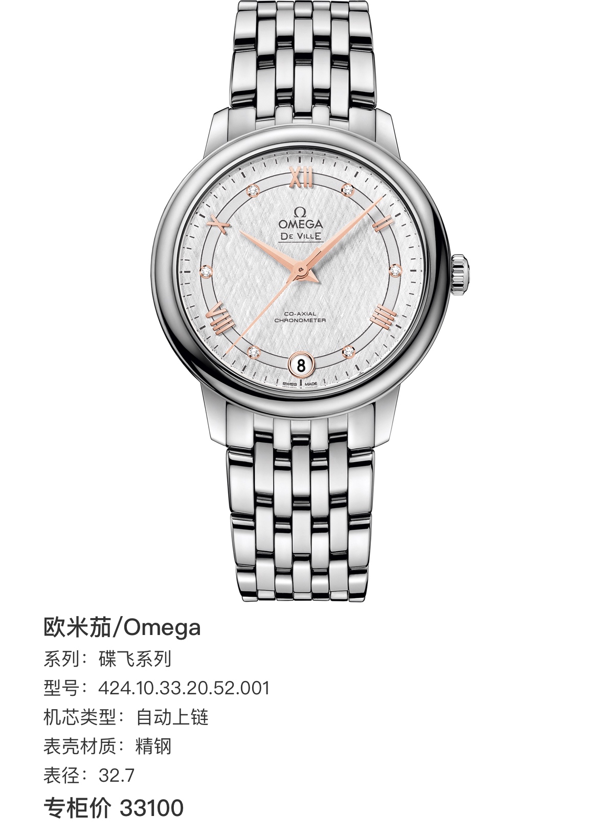 欧米茄/Omega 碟飞系列 424.10.33.20.52.001 自动上链 精钢 32.7 23年卡 专柜价33100。