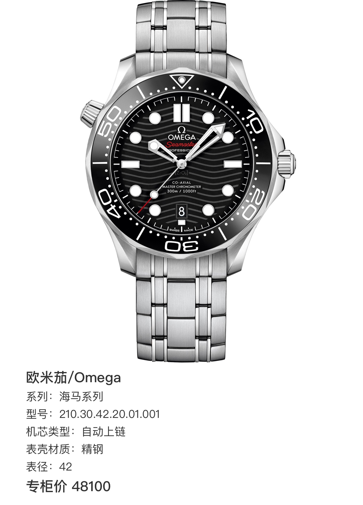 空白卡全套欧米茄/Omega 海马系列 210.30.42.20.01.001 自动上链 精钢 42 专柜价48100。