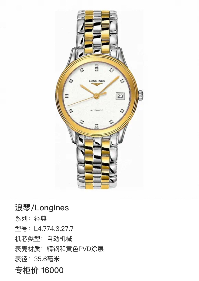 全新全套近期卡浪琴/Longines 经典 L4.774.3.27.7 自动机械 精钢和黄色PVD涂层 35.6毫米 专柜价16000
