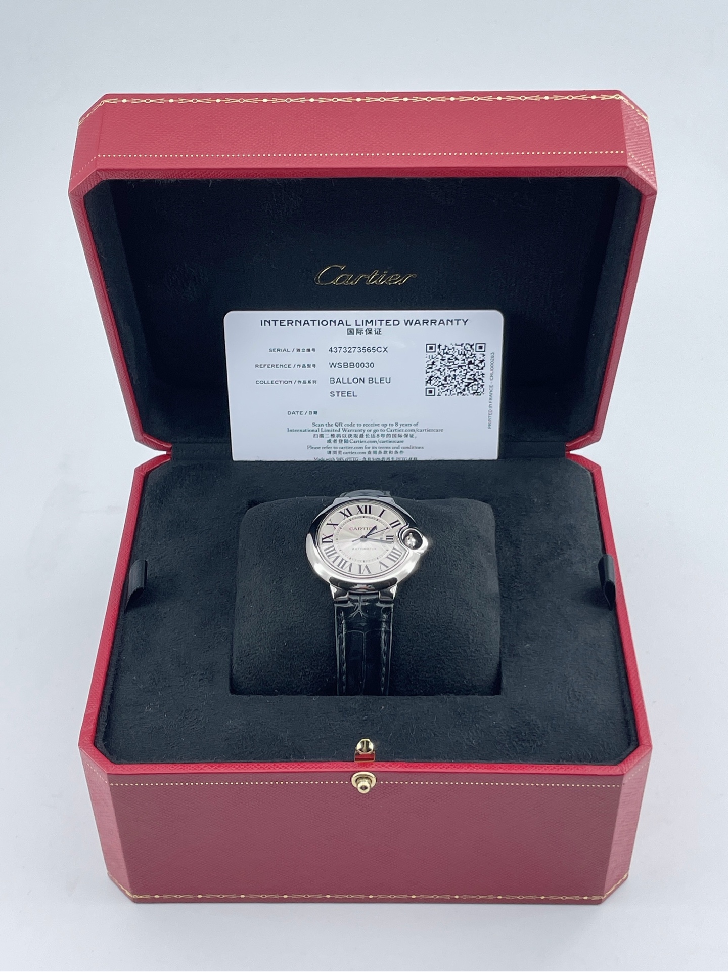 卡地亚 蓝气球腕表 WSBB0030 自动上链 精钢 33mm表径 23年全套 专柜价45300 现好价。