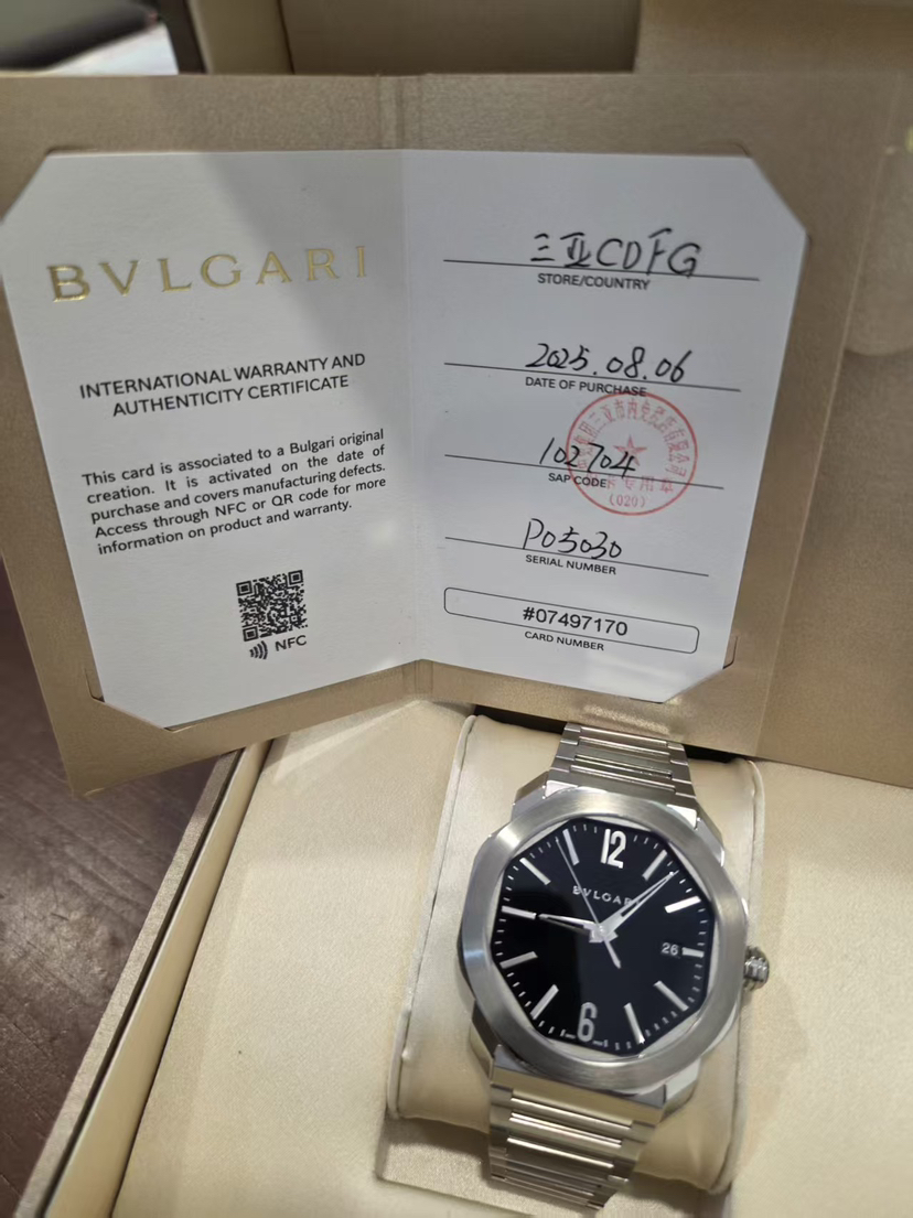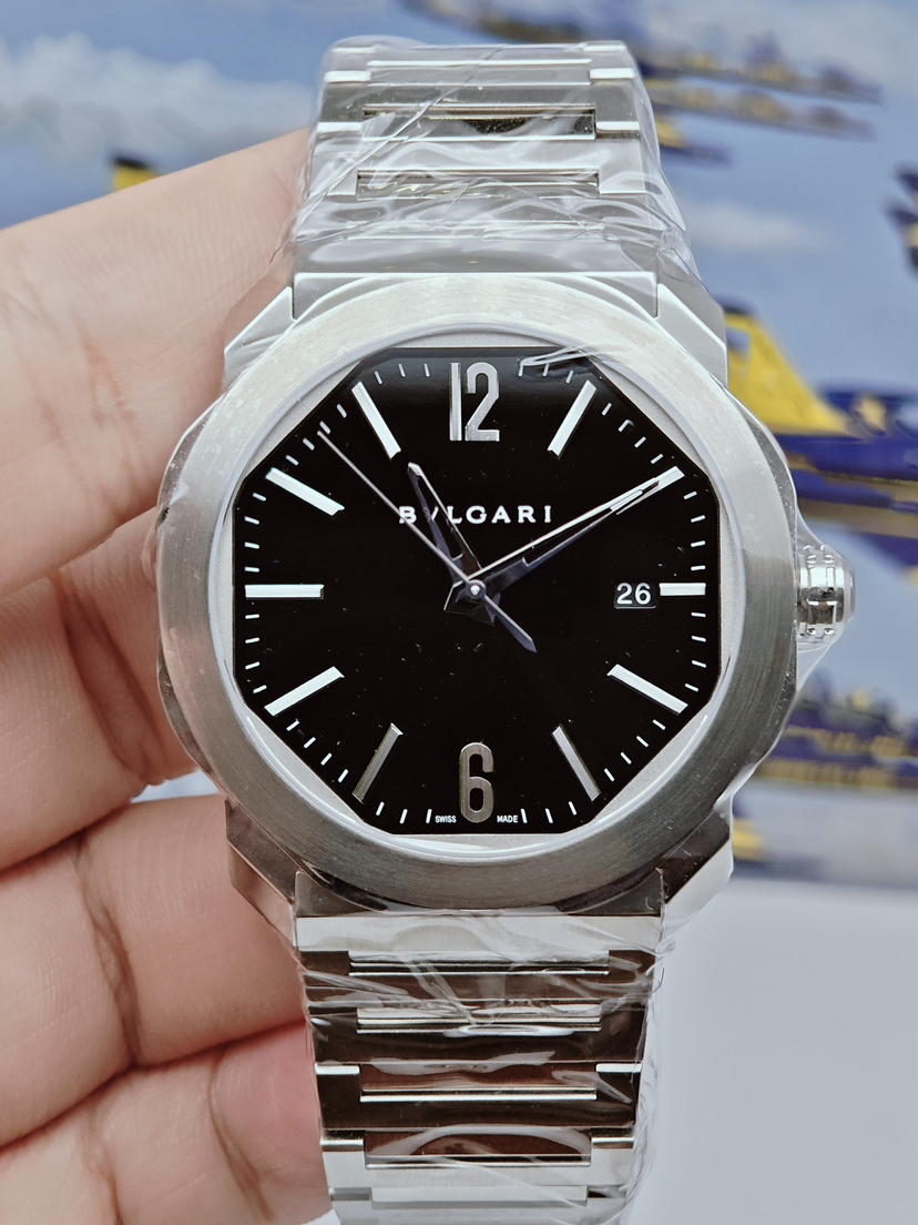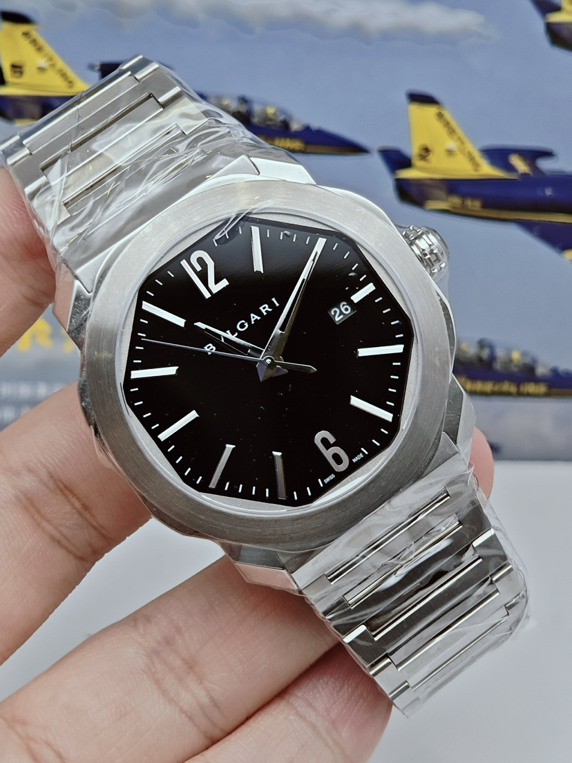 2025全新国行专柜货 宝格丽 Octo系列 男士自动机械表,41mm表径,100米防水,防刮蓝宝石镜面。旋入式设计表冠,防水性能比较好。黑色抛光陶瓷材质表盘,闪亮的镀铑指针和刻度,经典八角型表体,辨识度超高。