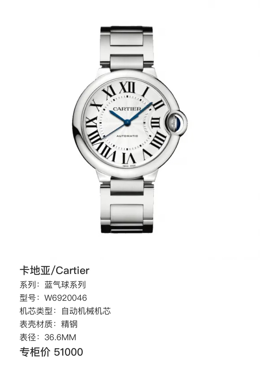 卡地亚/Cartier 蓝气球系列 W6920046 自动机械机芯 精钢 36.6MM 附件:单表 专柜价51000