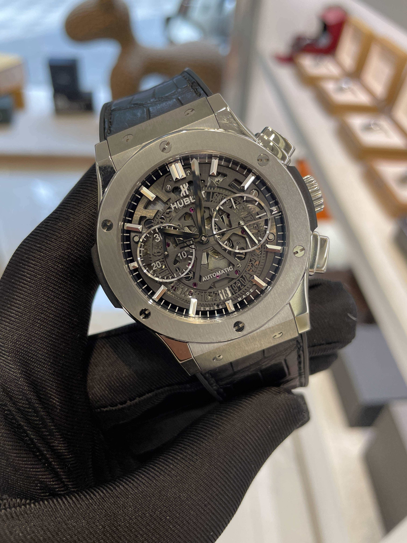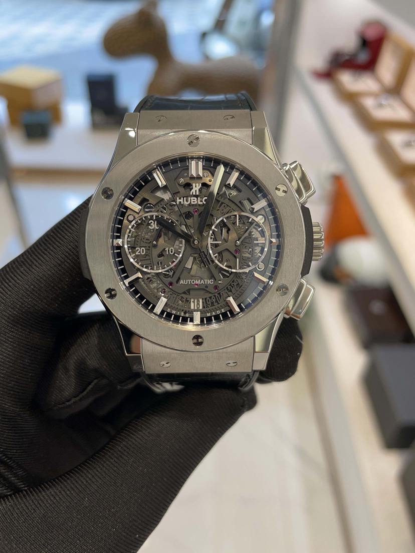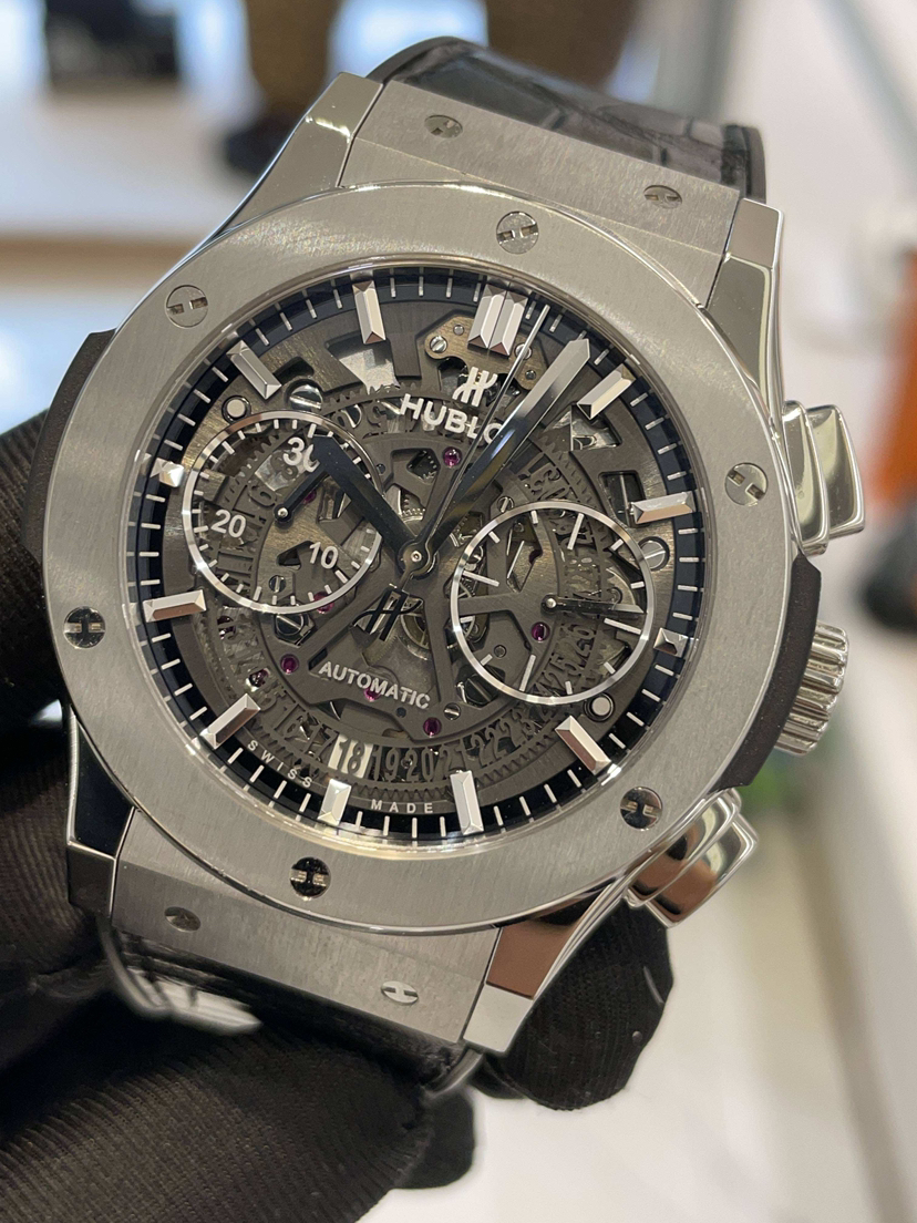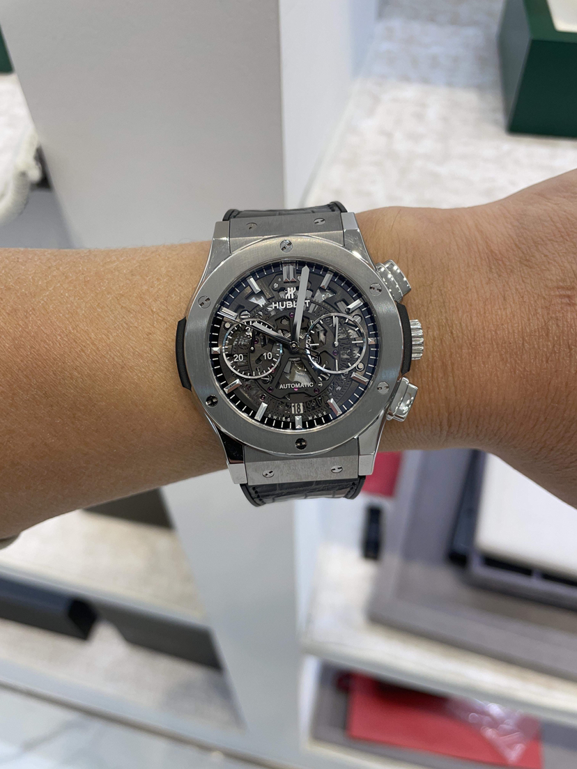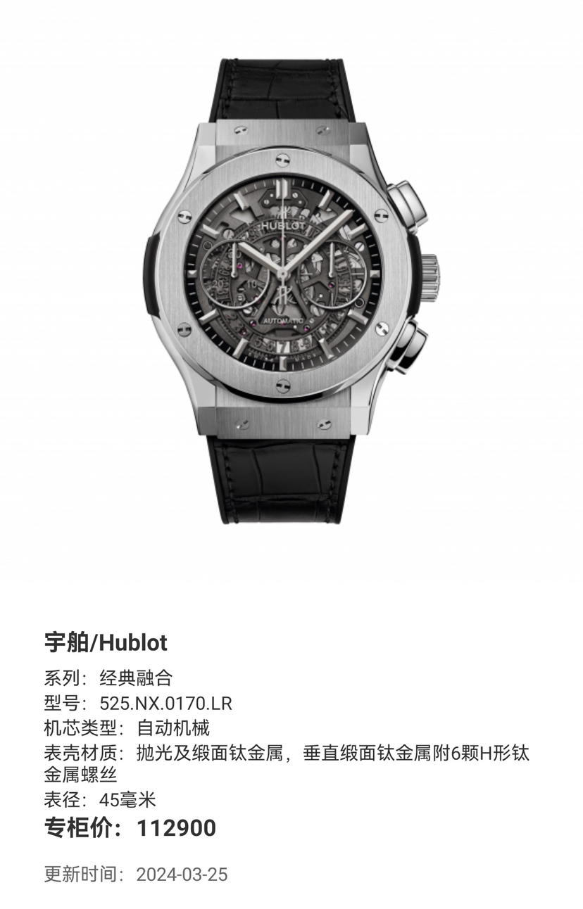 宇舶-经典融合,525.NX.0170.LR。单表无配件,45毫米钛合金自动机械计时,原价117400,现货[加油][加油][加油]。