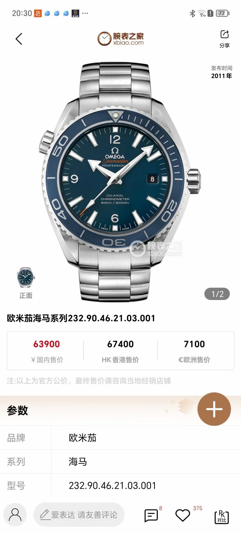 Omega 欧米茄 海马系列 232.90.38.20.03.001,自动机械腕表,钛金属材质,表径47.5mm,表带全长,85字头,未使用单表,公价¥63000。