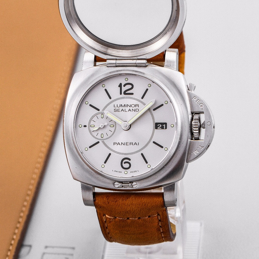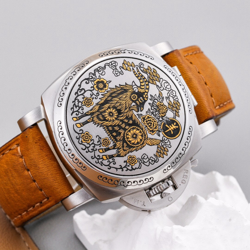 沛纳海 Luminor Sealand庐米诺系列PAM00848 ,全球限量100枚,精钢,成色完美,将鼠年图案生动地镌刻于其上表盖由意大利杰出的工艺大师采用古老的sparsello雕刻技法精心打磨,表盖内侧有一面小镜,兼具美学与功能性的, 为灰色表盘提供保护,日期显示,表径44mm,公价179700,现在好价