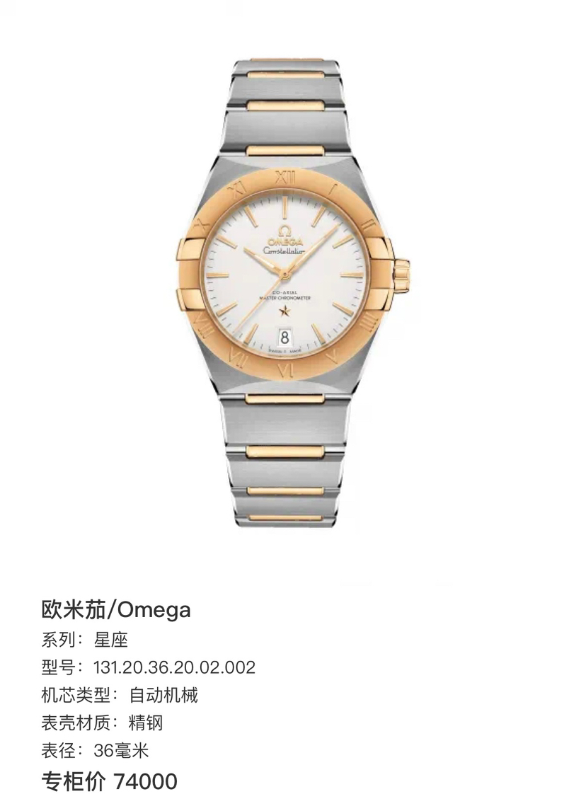 欧米茄/Omega 星座 131.20.36.20.02.002 自动机械 精钢 36毫米 专柜价74000。