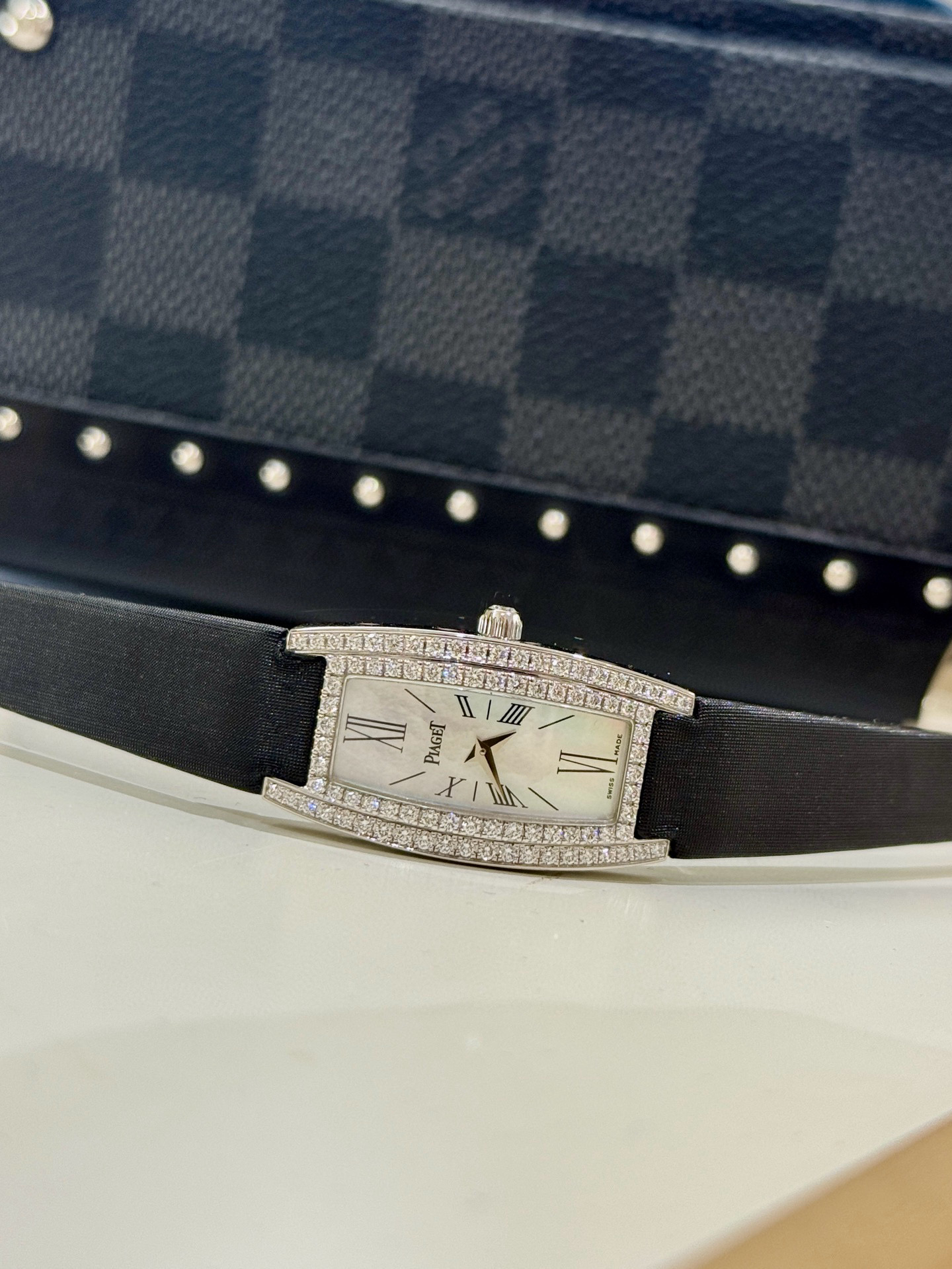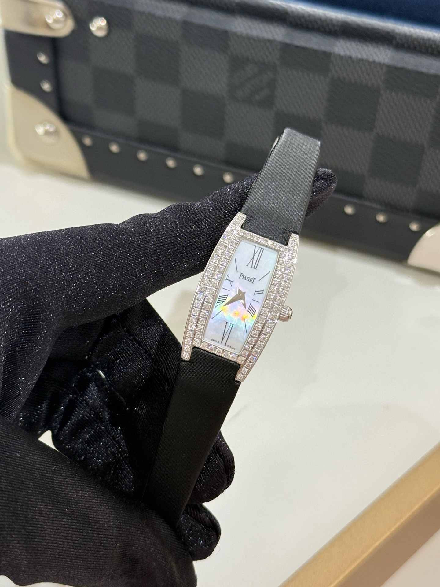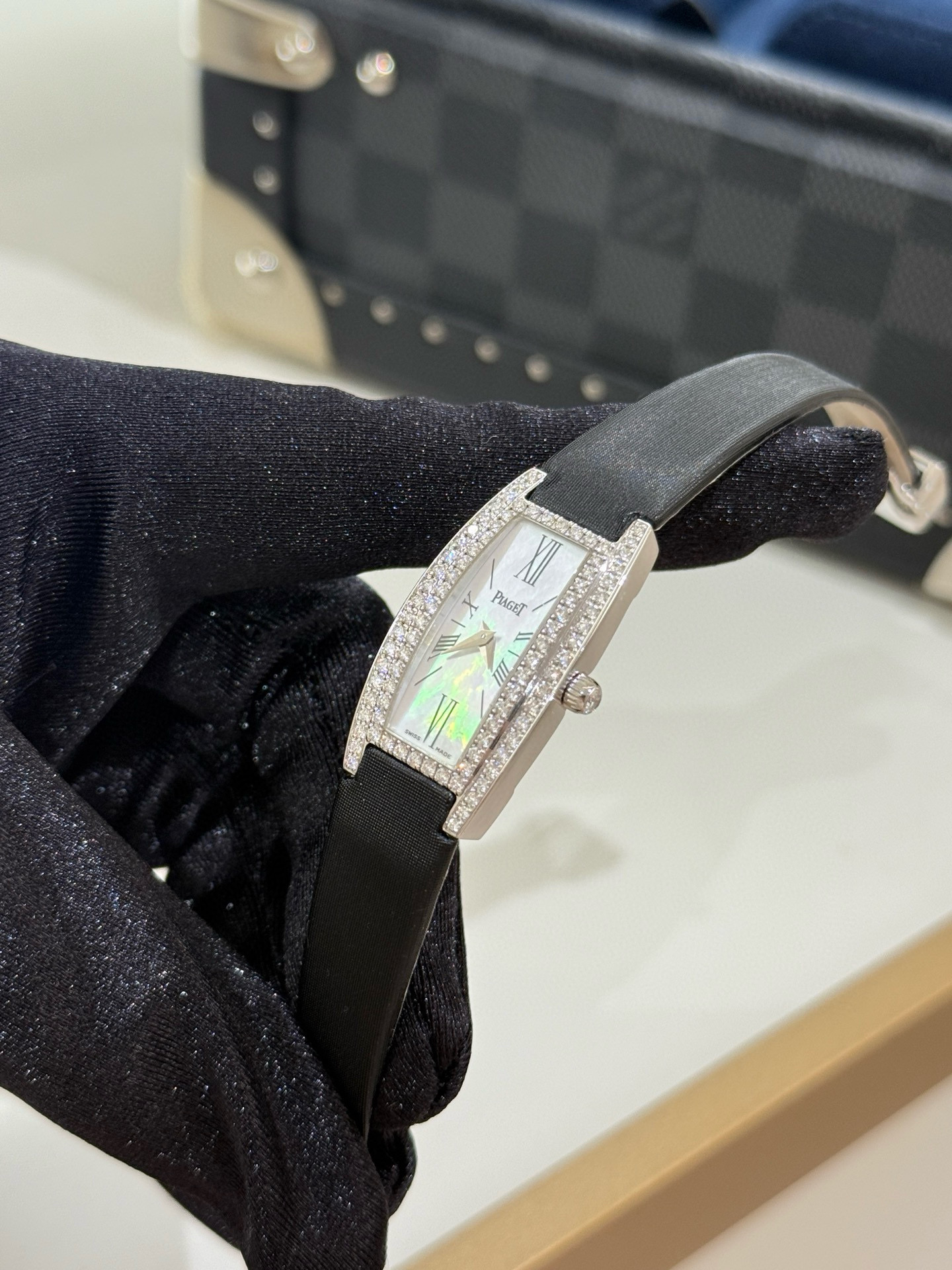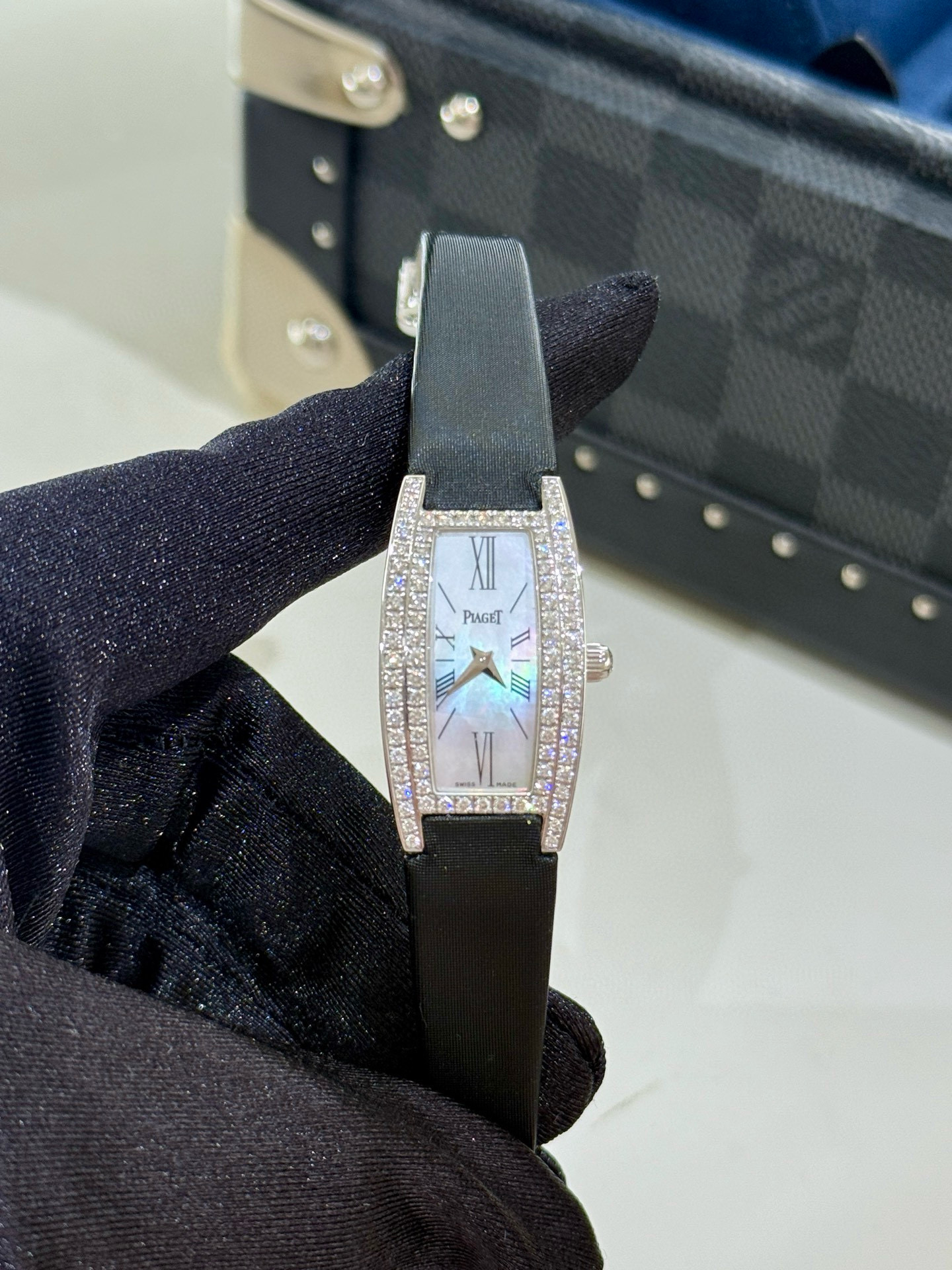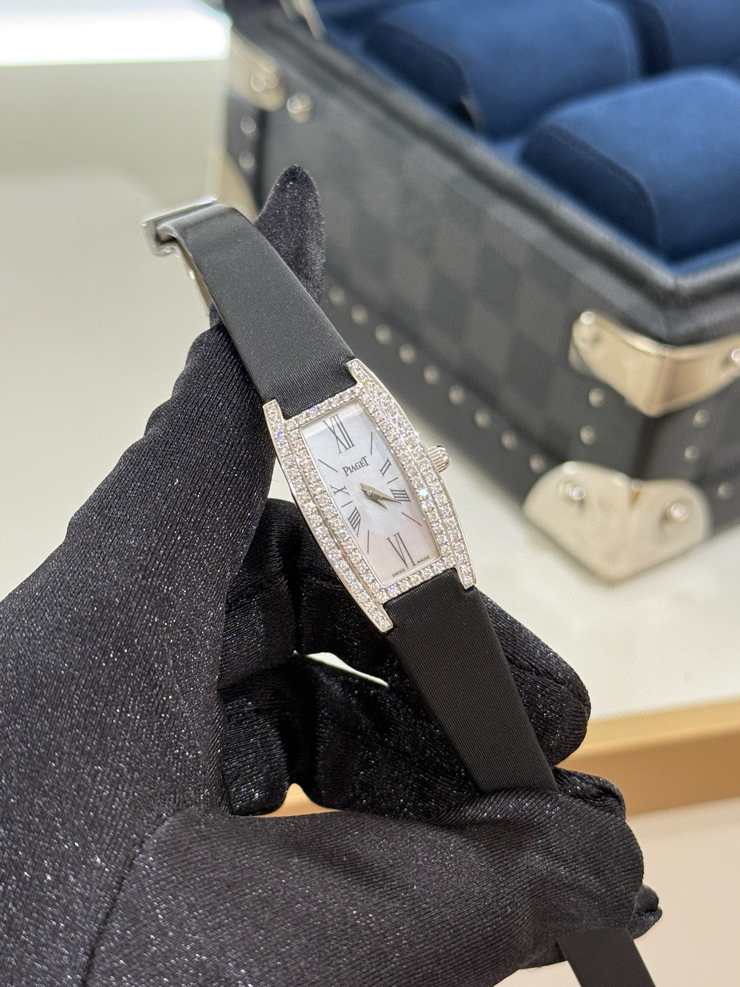 伯爵LIMELIGHT GALA系列G0A27063,18k白金材质,表壳表扣原镶钻石,酒桶形腕表,18*34mm表径,贝母面罗马刻度。公价255000,现货好价。