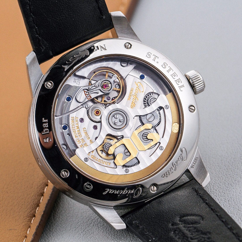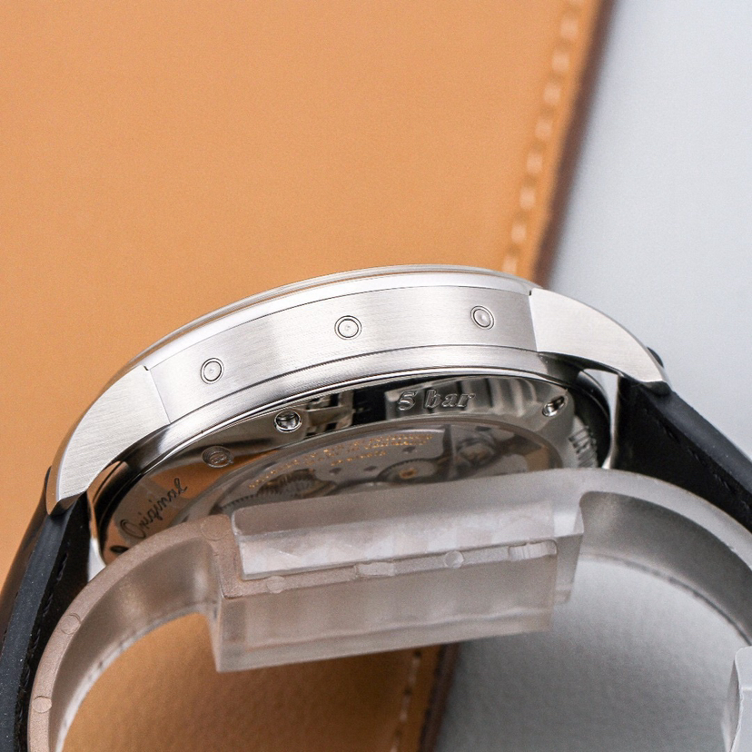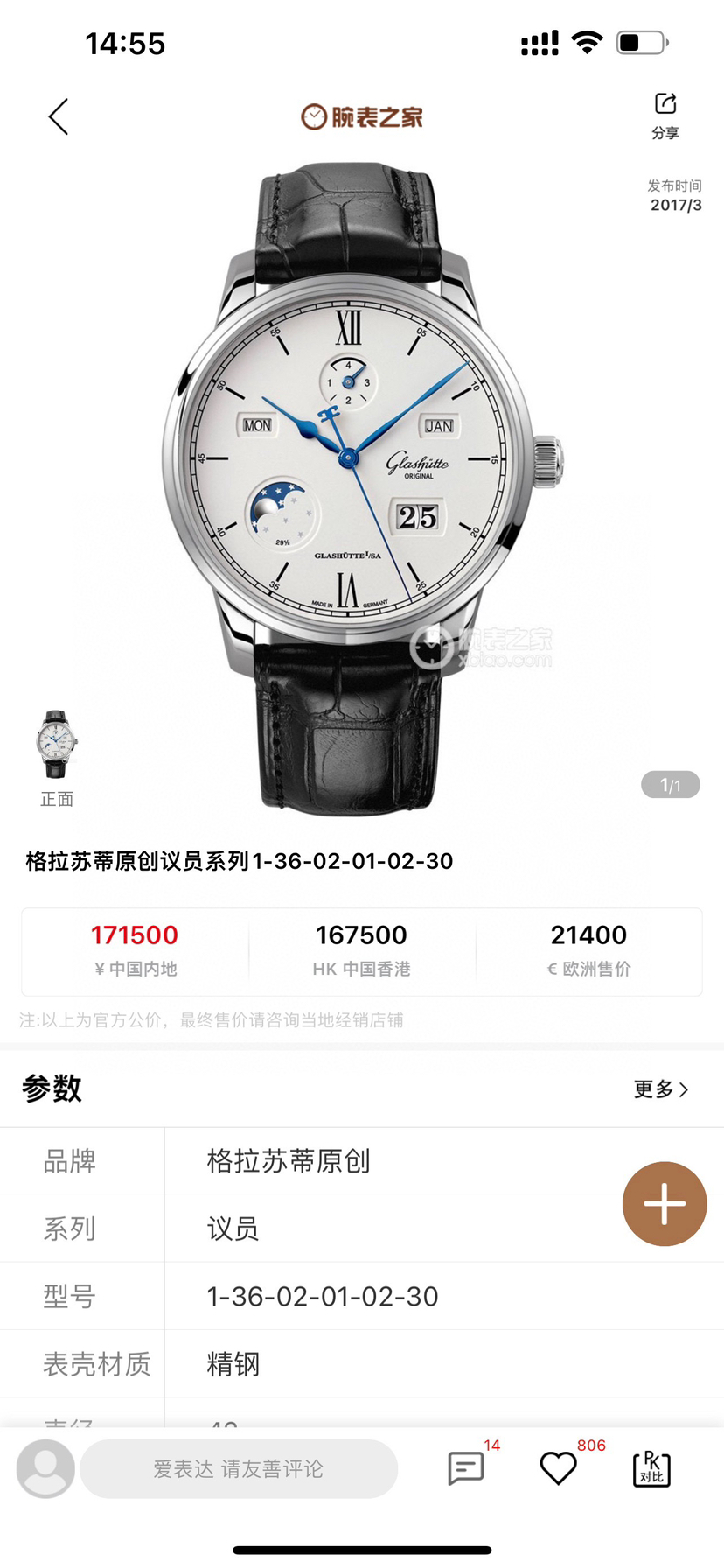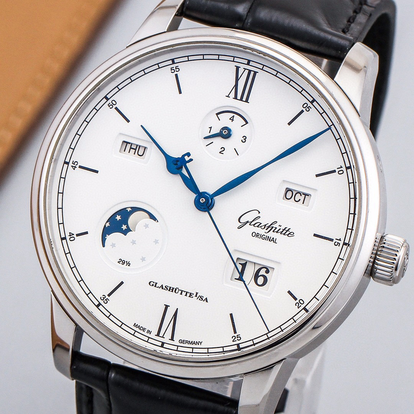 格拉苏蒂原创议员万年历系列1-36-02-01-02-30自动机械男士腕表,42mm表径,银白色表盘,精钢材质,日期、星期、年历、万年历、月相大日历,折叠表扣,公价171500,好价