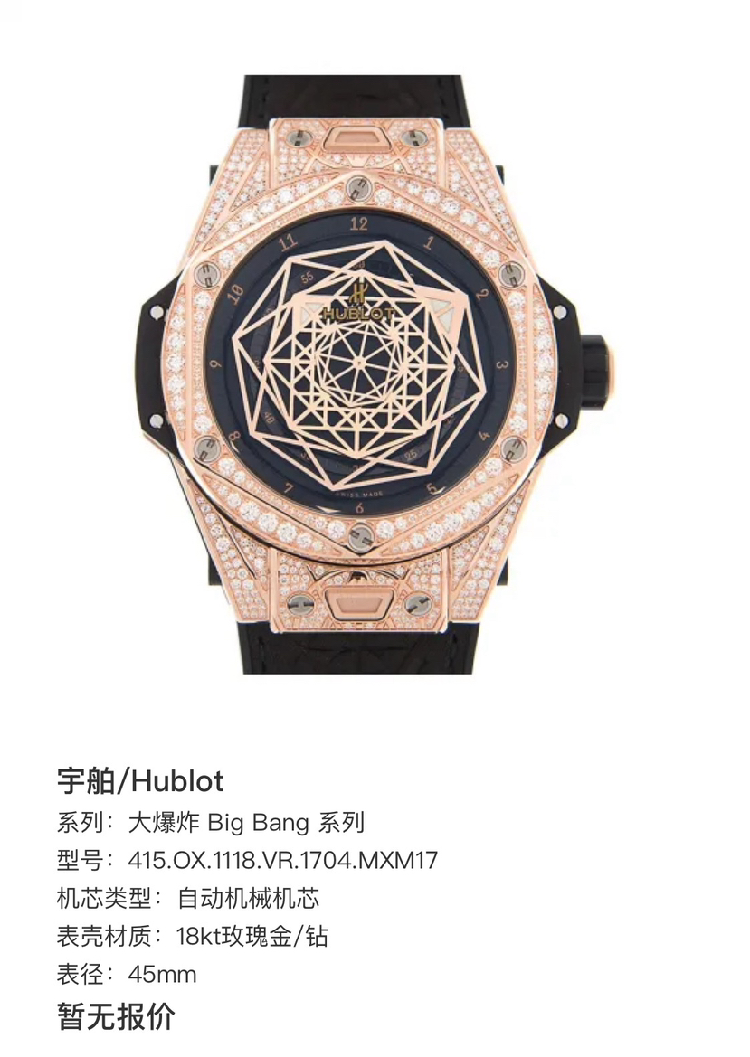 宇舶/Hublot 大爆炸 Big Bang 系列 415.OX.1118.VR.1704.MXM17 自动机械机芯 18kt玫瑰金/钻 45mm 专柜价445000