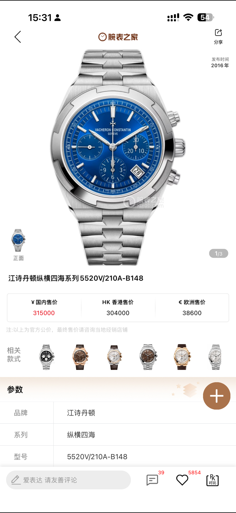 江诗丹顿/Vacheron Constantin 纵横四海 5520V/210A-B148 自动机械 不锈钢 42.5毫米 专柜价315000。25年9月卡,全新未使用,现货好价好折扣!