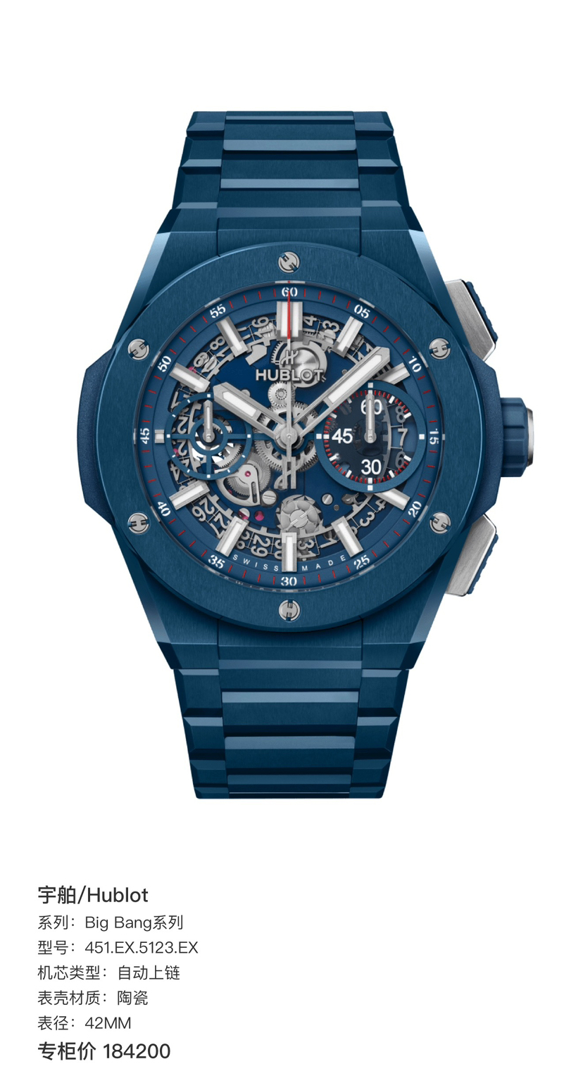 宇舶/Hublot Big Bang系列 451.EX.5123.EX 自动上链 陶瓷 42MM 专柜价184200。全新全套25年7月卡,现货好价!