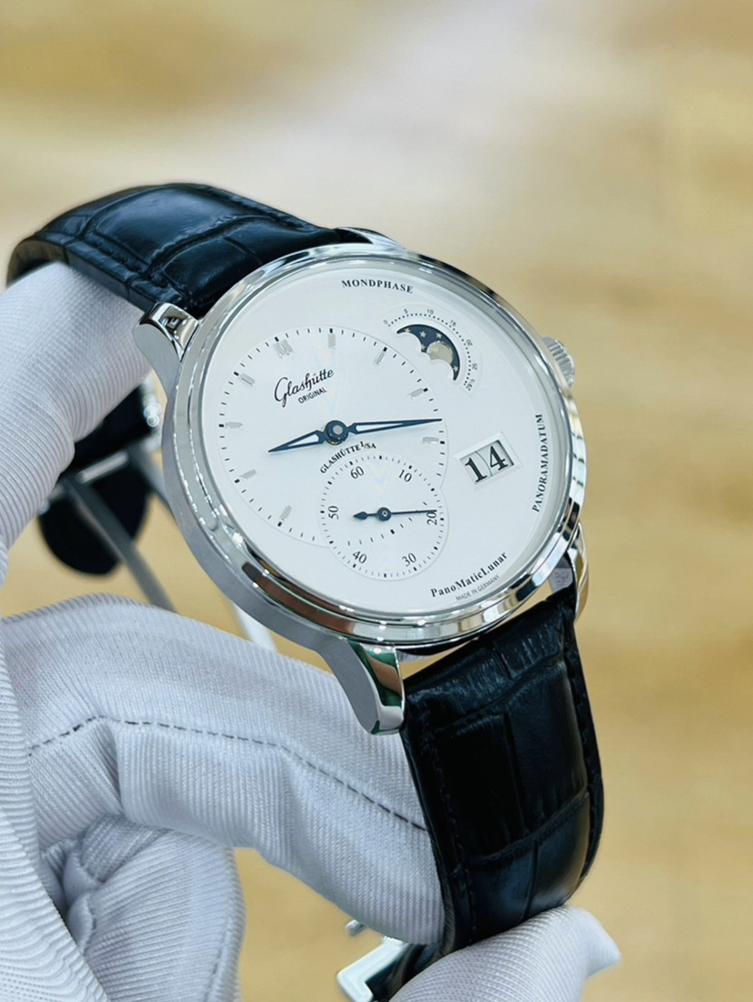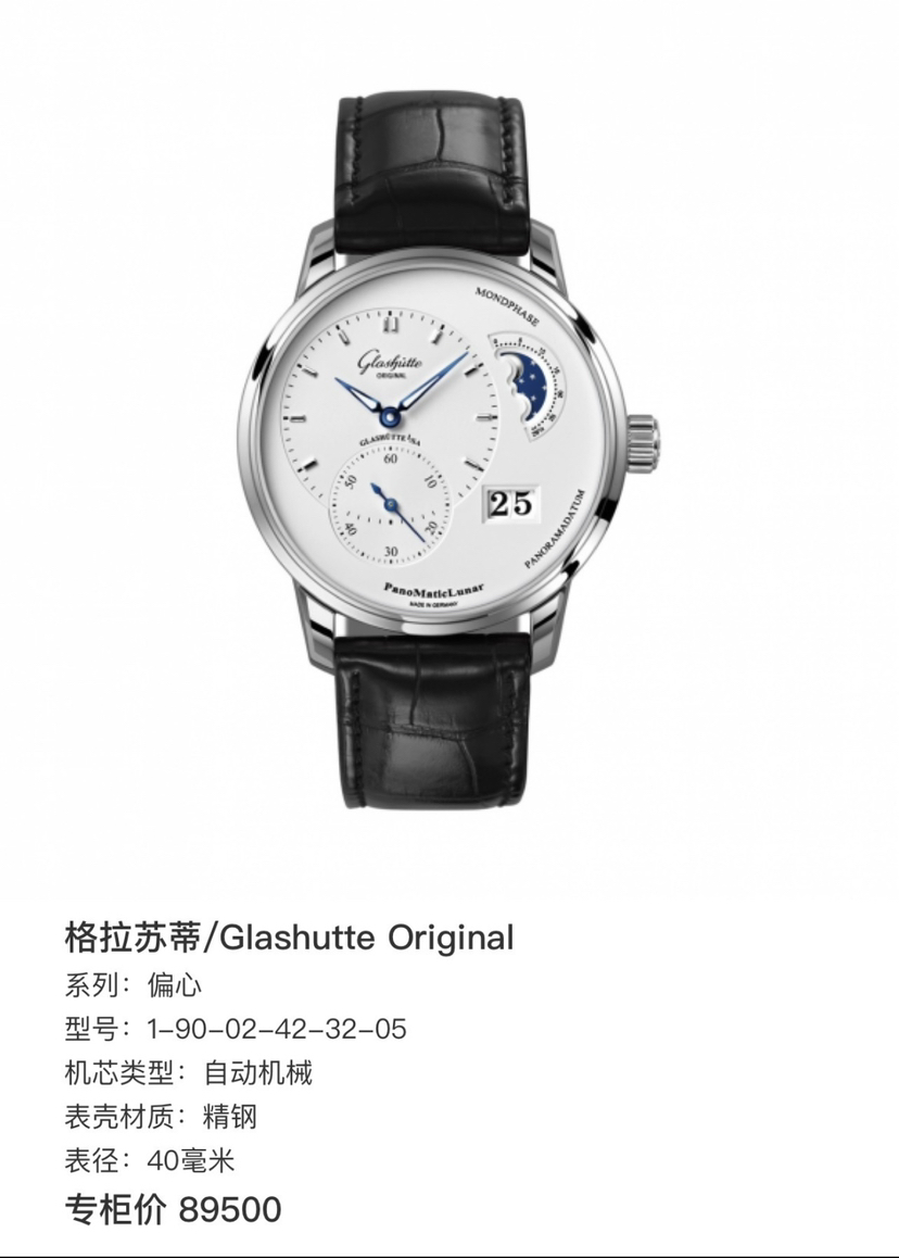 格拉苏蒂偏心型号1-90-02-42-32-05男士自动机械手表动力储备42小时 白色表盘 防水50米搭配,表径40mm,精钢,搭载90-02自产机芯 ,极品单表,后配全新表带,公价89500
