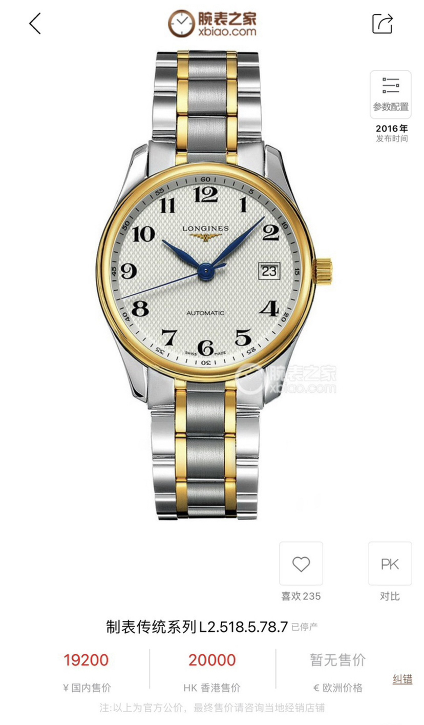 浪琴制表传统L2.518.5.78.7,男士自动机械、表径36mm,间金表带,带日期显示,22年全套,极品成色,公价19200现货好价