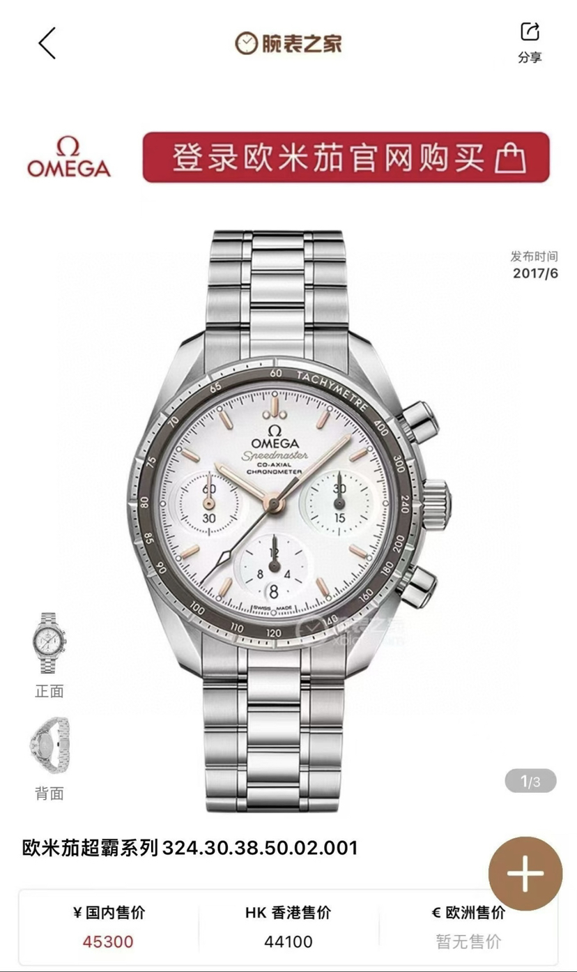 欧米茄/Omega 超霸系列 324.30.38.50.02.001 男士腕表,自动上链 精钢 38MM表径, 极品成色,24年全套 专柜价 45300