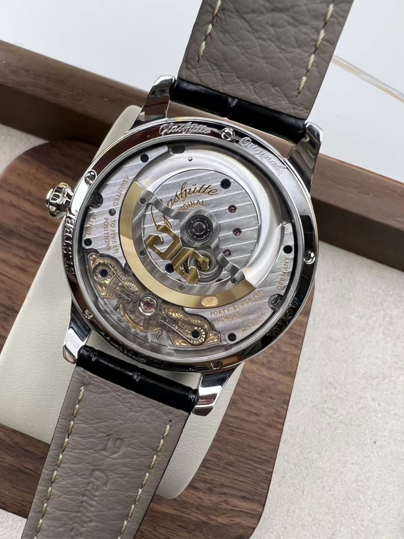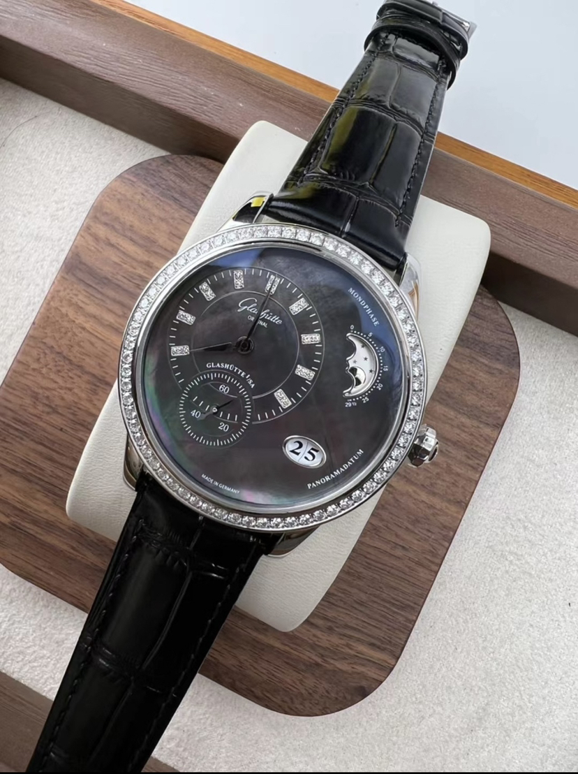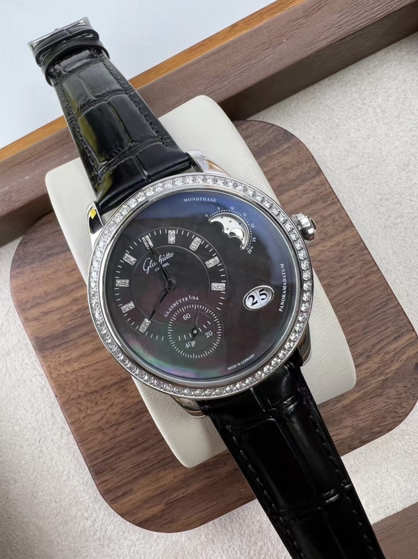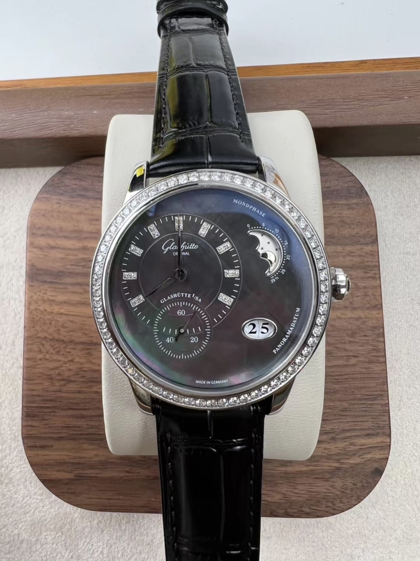 格拉苏蒂原创偏心月相,1-90-12-02-12-02,原镶钻圈原钻,贝母灰盘钻刻,表径39.4mm,双鹅颈微调,四分之三夹板,钢壳皮带,极品单表,后配全新表带,公价141500。现货好价