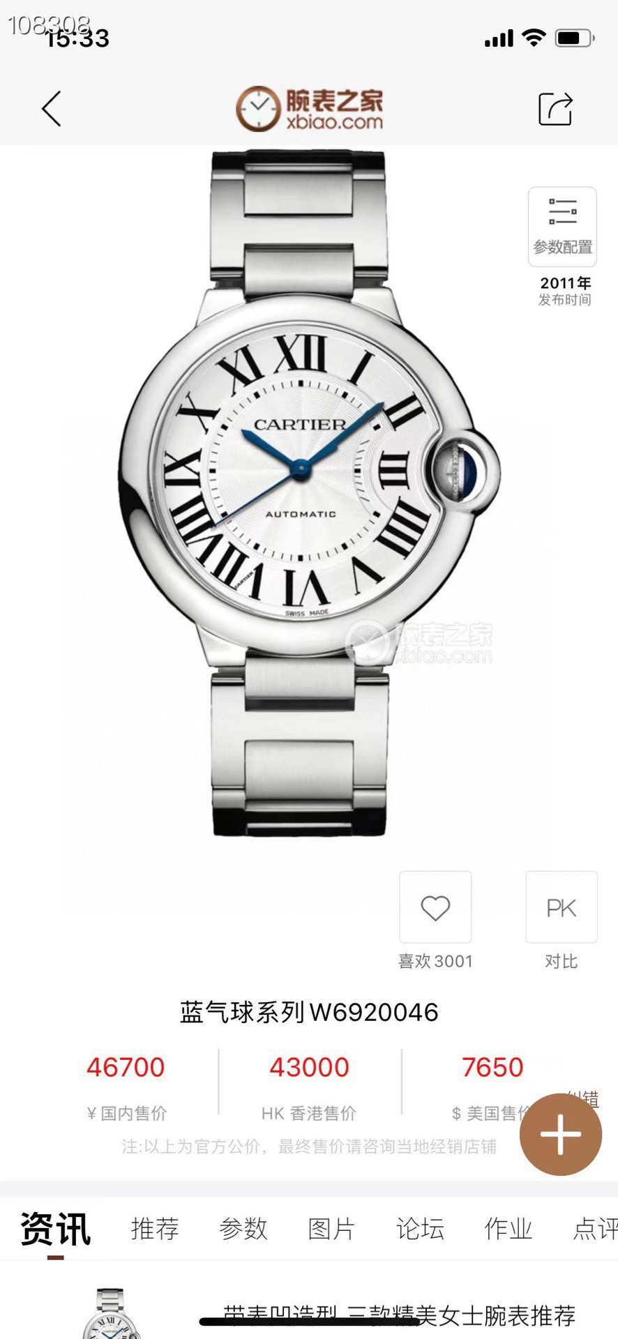 卡地亚/Cartier 蓝气球系列 W6920046 自动机械机芯 精钢 36.6MM 专柜价51000