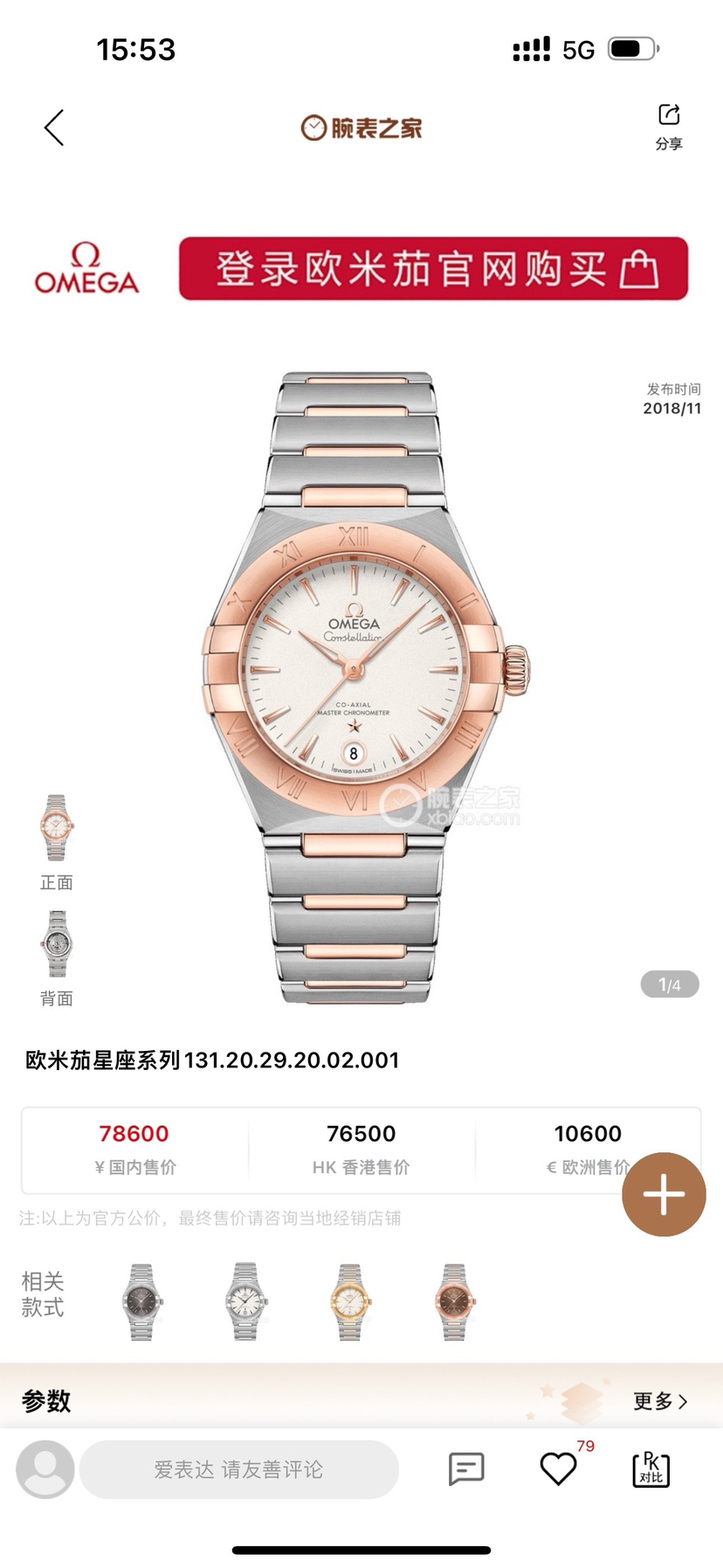 欧米茄星座系列 131.20.29.20.02.001 极品成色 自动上链 精钢‑18K金 29mm 专柜价78600