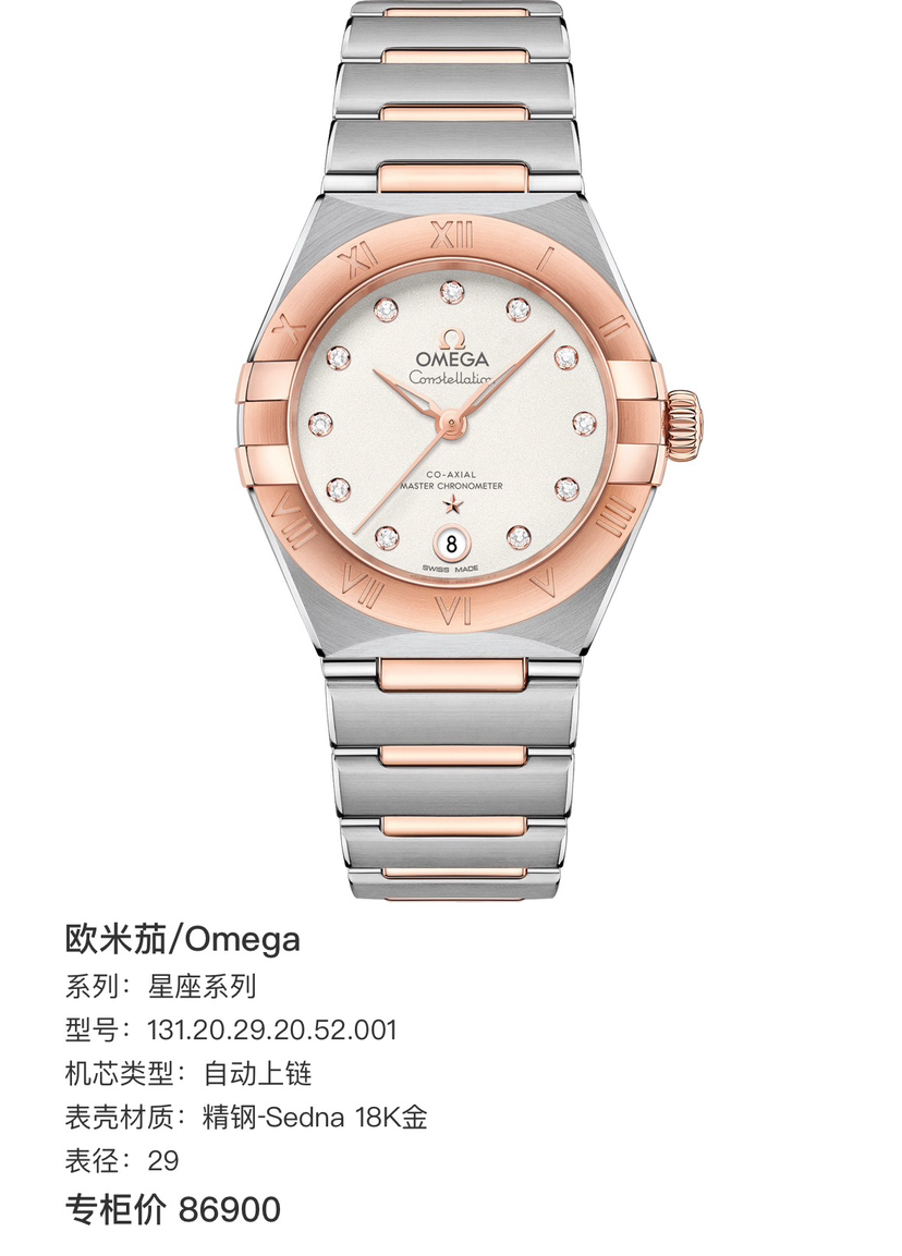 欧米茄/Omega 星座系列 131.20.29.20.52.001 自动上链 精钢‑Sedna 18K金 29 专柜价86900。