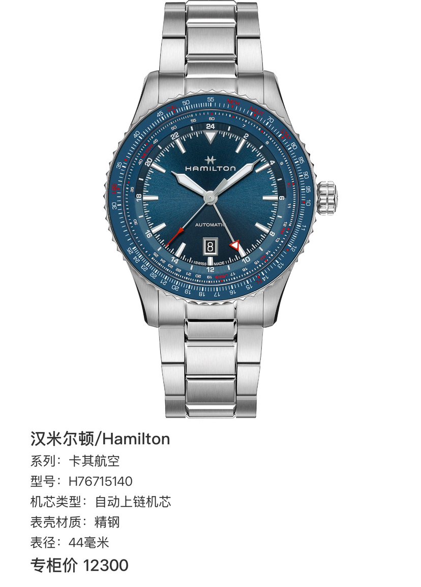 汉米尔顿/Hamilton 卡其航空 H76715140 自动上链机芯 精钢 44毫米 专柜价12300 21年大全套,现货好价!