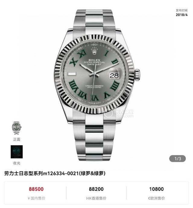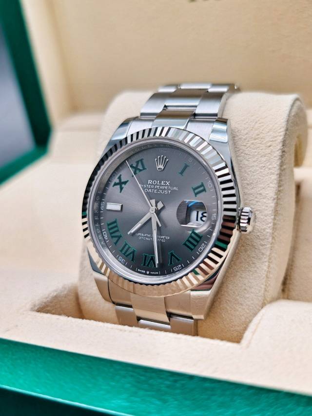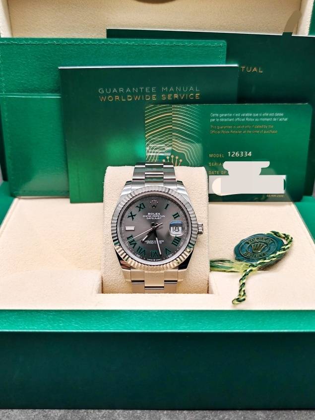 劳力士126334-0021日志型,灰盘罗马刻度,绿萝,板带,41mm表径,全套未使用品,现货有。