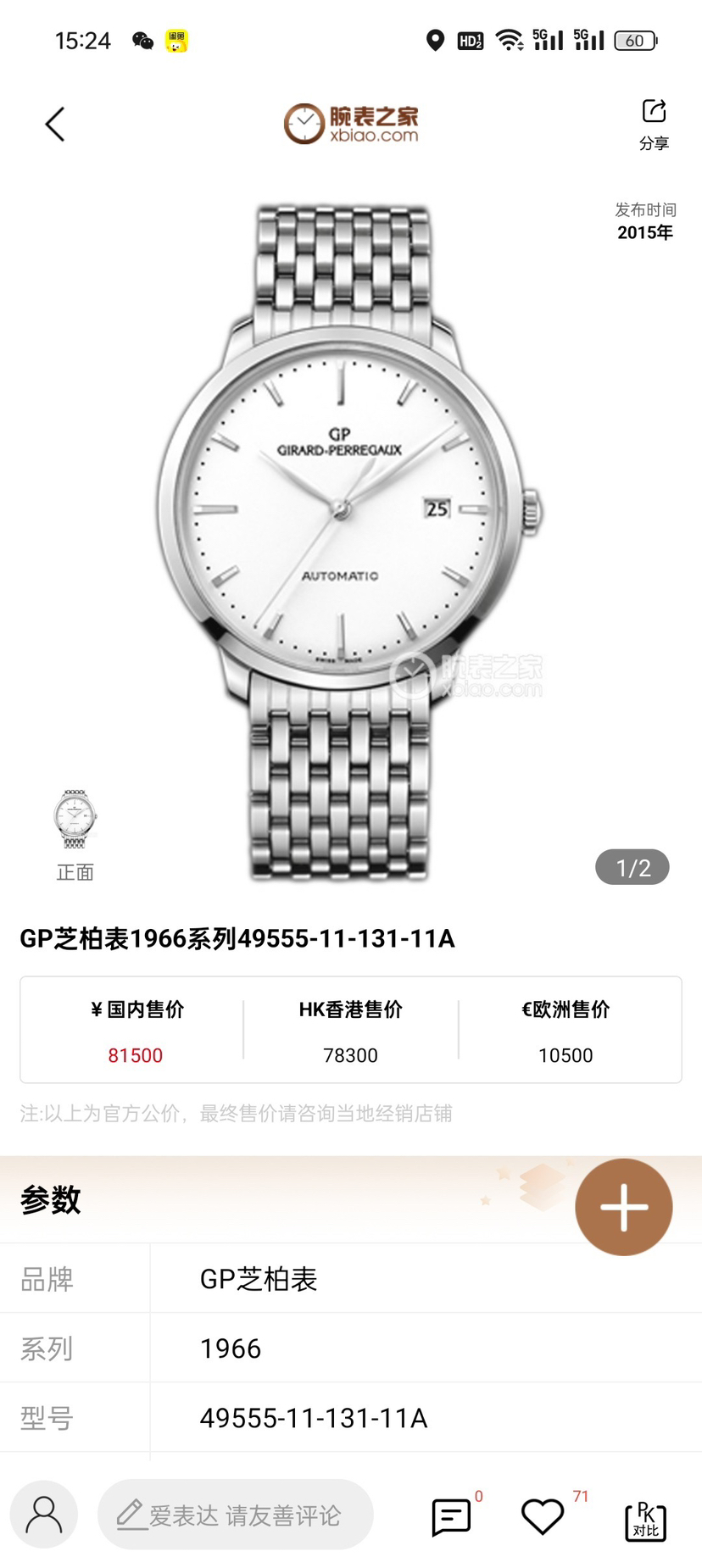 芝柏 1966系列49555-11-131-11A精钢材质 40表径 自动机械打三针带日历 公价81500 国行全新当天卡,现货好价。