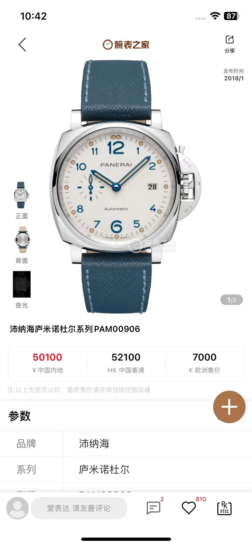 沛纳海Luminor Due庐米诺杜尔PAM00906机械男性