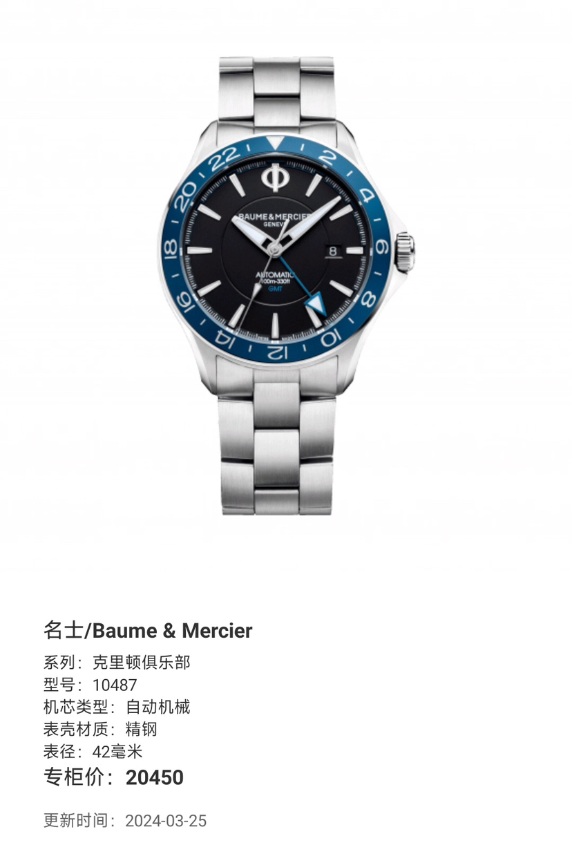 名士/Baume & Mercier 克里顿俱乐部 10487 自动机械 精钢 42毫米 公价23250元 国行全新未使用25年12月卡,现货好价!