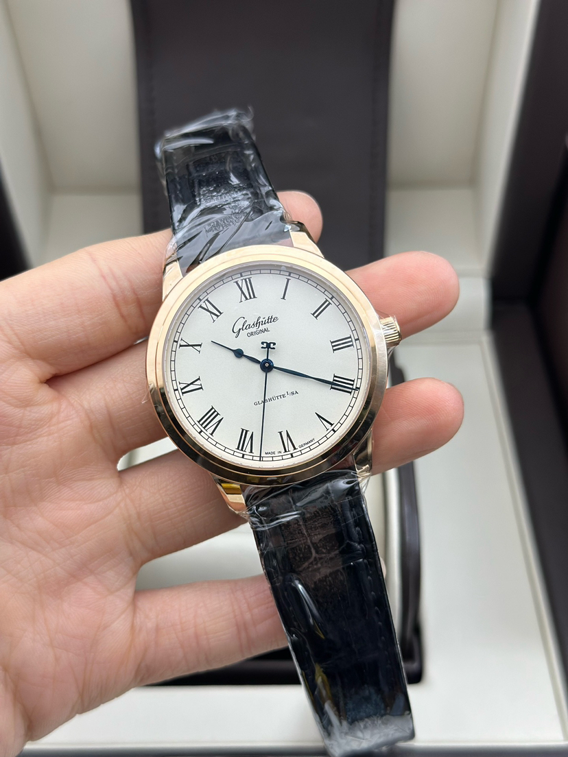格拉苏蒂 议员 1-39-59-01-05-04 自动机械男士腕表 40毫米 这款腕表采用18k玫瑰金贵金属打造,表壳圆润光泽闪耀,白色表盘外缘装饰轨道式分钟刻度,搭配黑色罗马数字时标与蓝钢指针提供清晰读时,秒针尾端装饰独特的“双G”标志,与背透内置的Cal.39-59机芯摆陀相呼应,提供40小时动力储备,经典的鹅颈式微调装置彰显德式顶级制表技艺。公价122500 ,全新全套送礼未使用品!现货特价!
