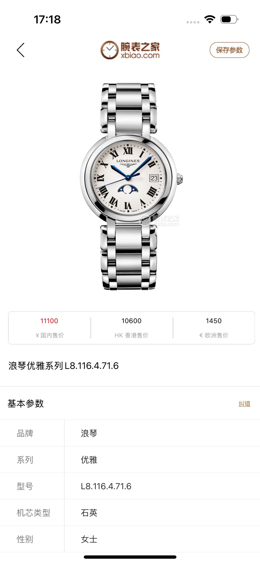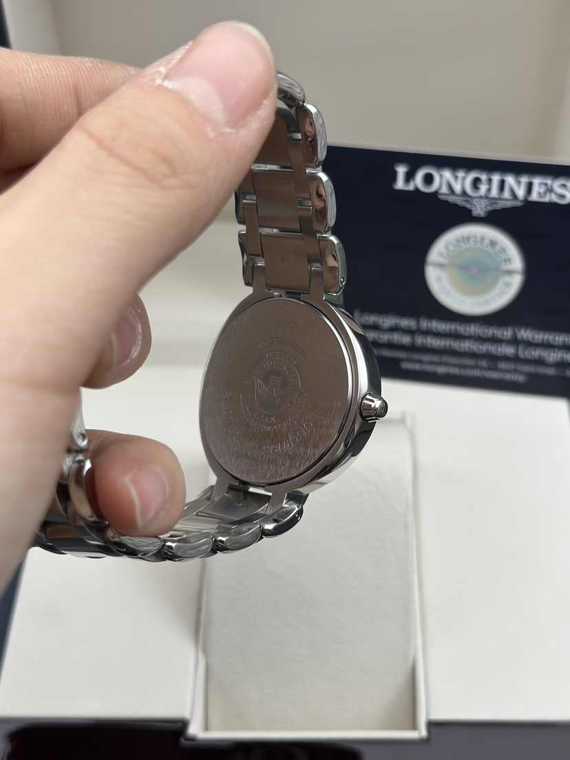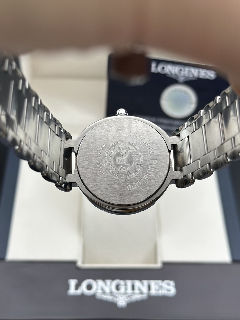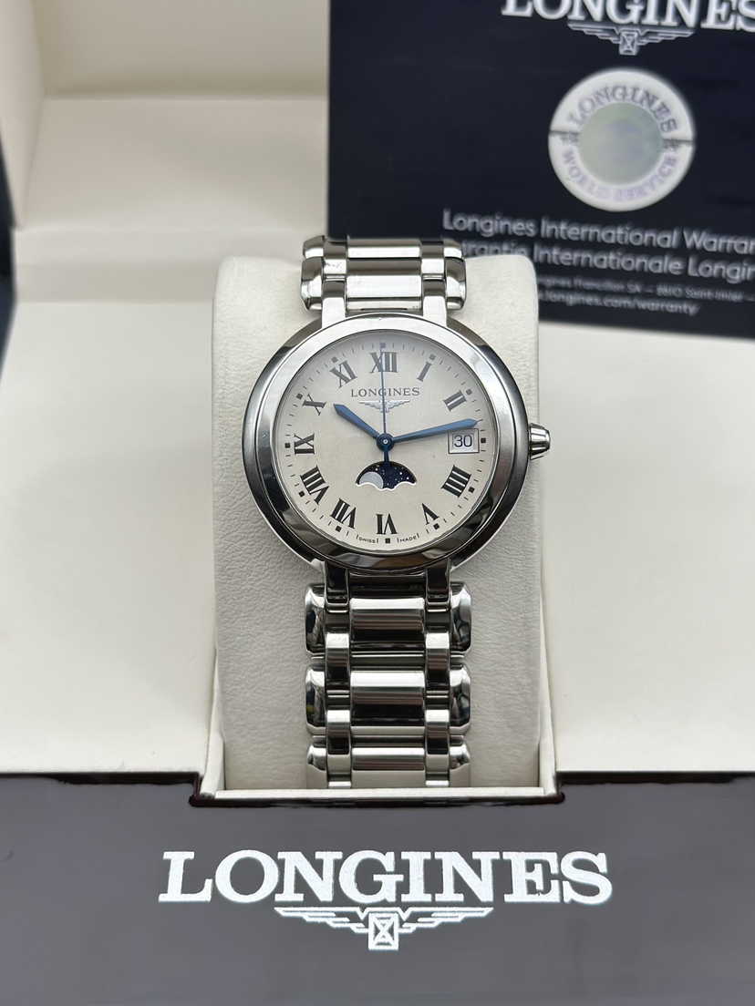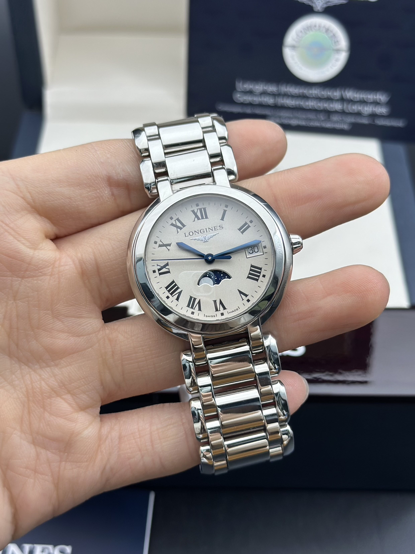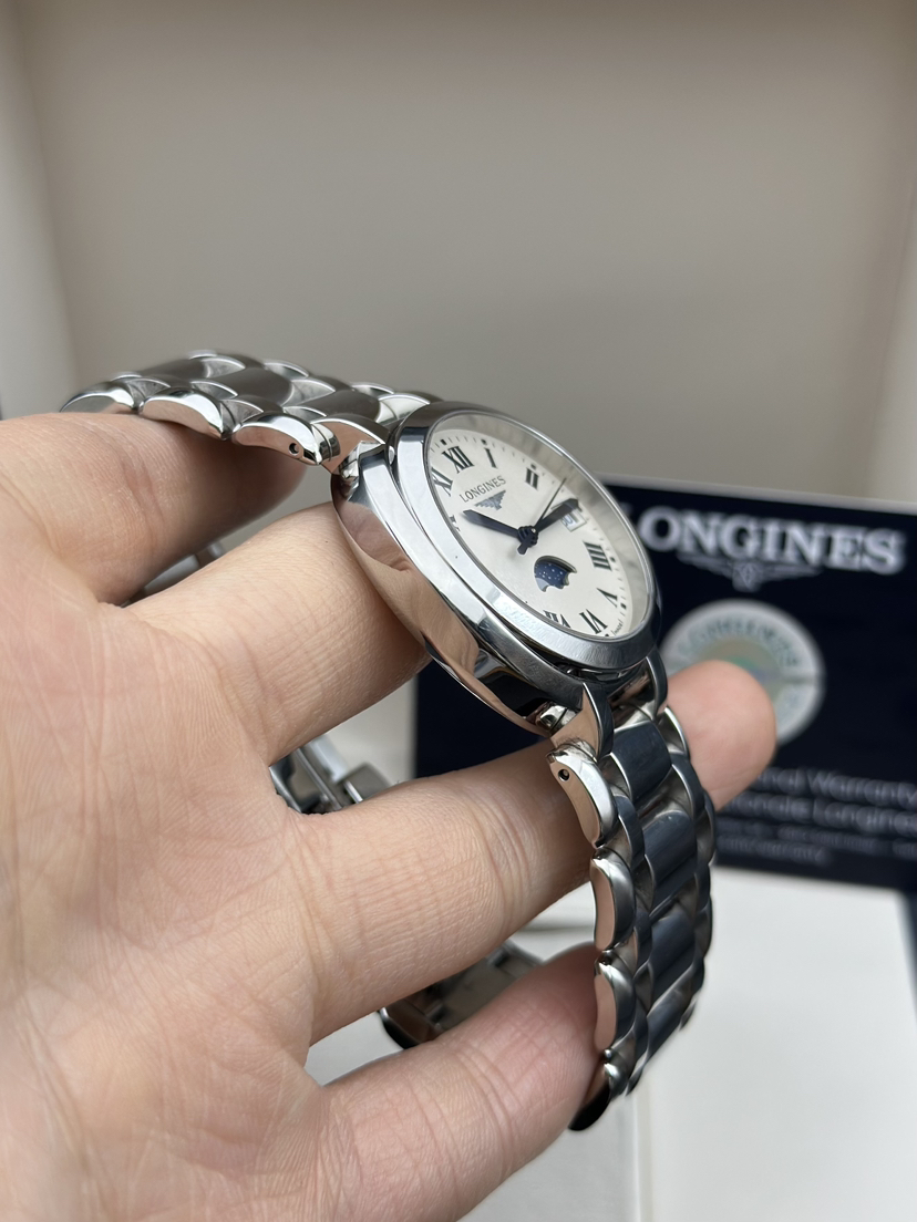 浪琴 优雅系列 L8.116.4.71.6石英女芯机表,稀有34大表径,耐磨精钢材质,石英机芯走时精准,自带示显期日以及月相示显功能。完美成色2023年全套 公价11100 大热门款。现好价带走!。