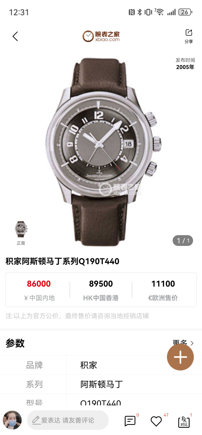 积家阿斯顿马丁系列Q190T440 积家与阿斯顿马丁联名的经典作品之一 自动机械 表径42mm 钛金属材质 全球限量1000枚 带小时/分钟/秒针 日期显示 机械闹铃 单表 工价86000元 现货好价