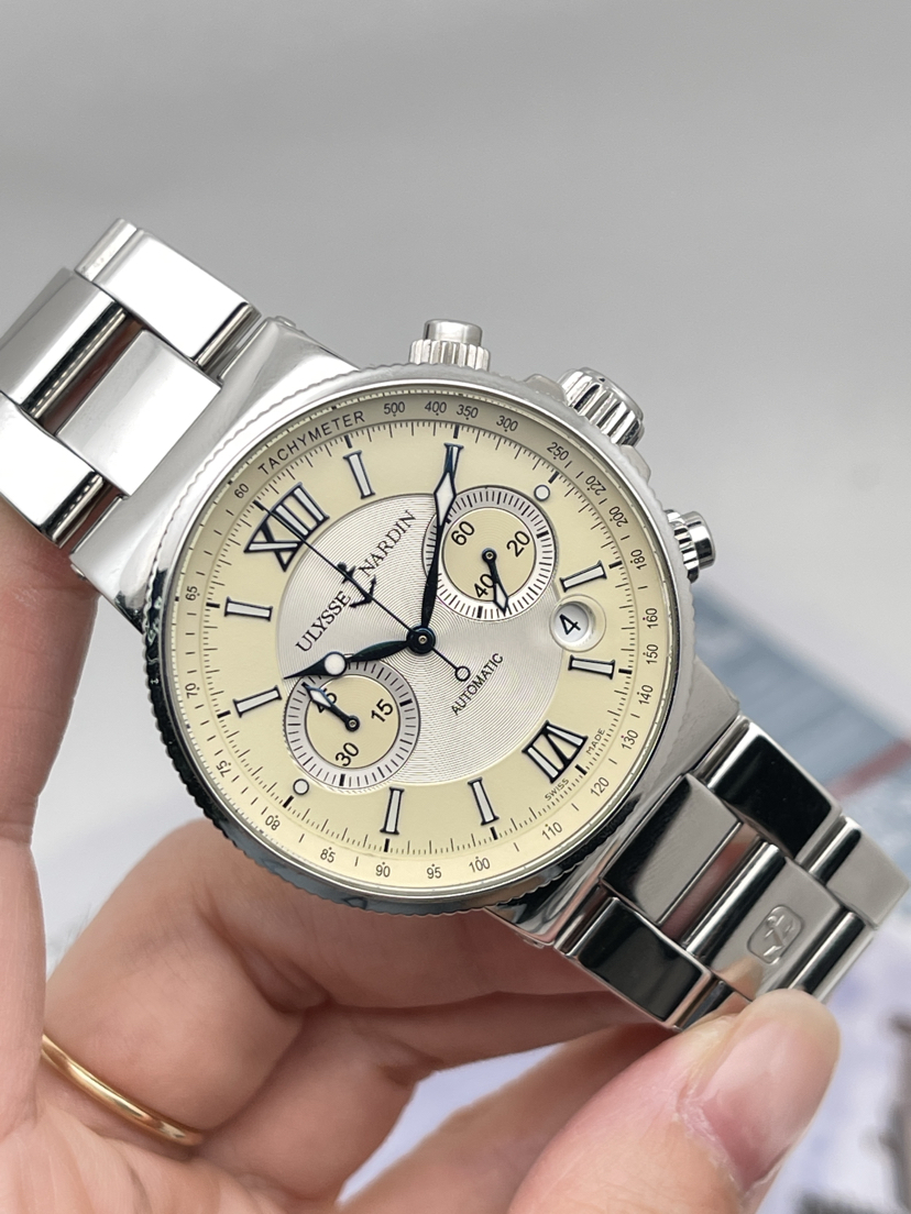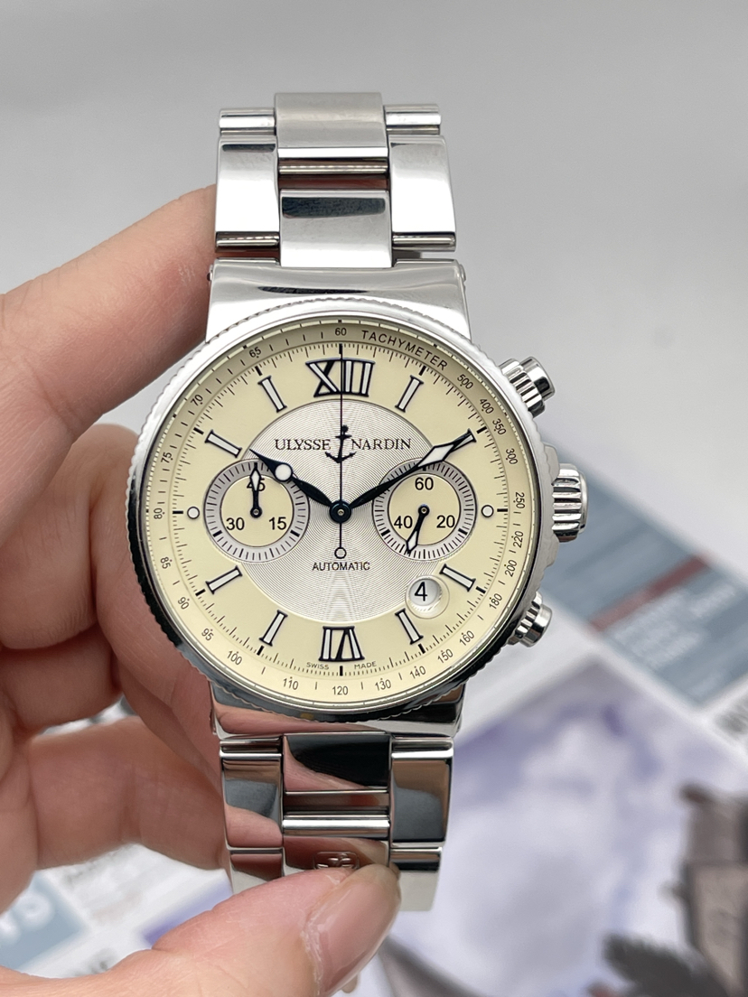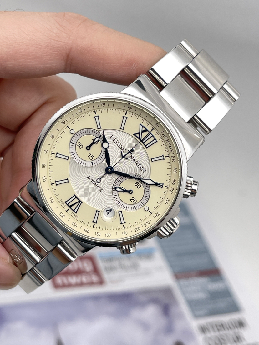 雅典353-66-7 经典航海系列41mm复古奶黄色盘面搭配烤蓝工艺指针刻度 透底自产计时机芯 原装钢带 200m防水 原价81000 现货好价