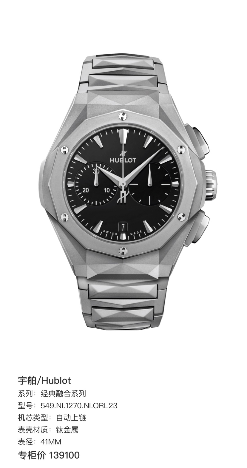 宇舶 经典融合系列 549.NI.1270.NI.ORL23 自动上链 钛金属 41MM 专柜价139100 全套全新好价。