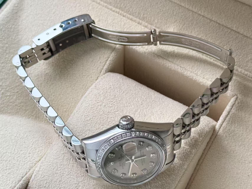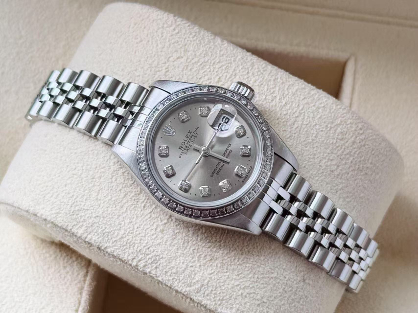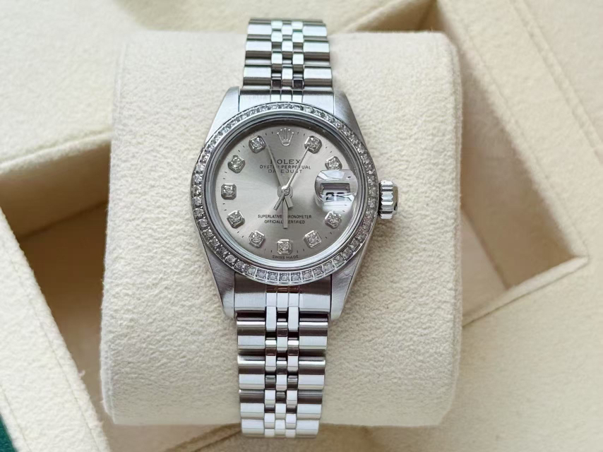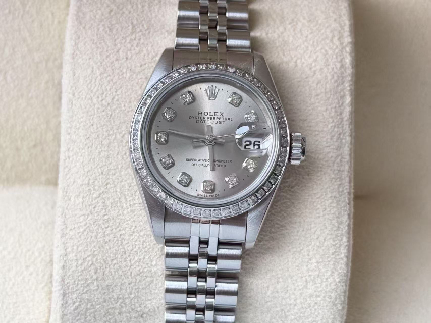 劳力士69174女装日志,后换银盘钻刻,外圈后镶钻,表径26mm,腕周175左右,整体新,极品状态,单表无附件,现货好价