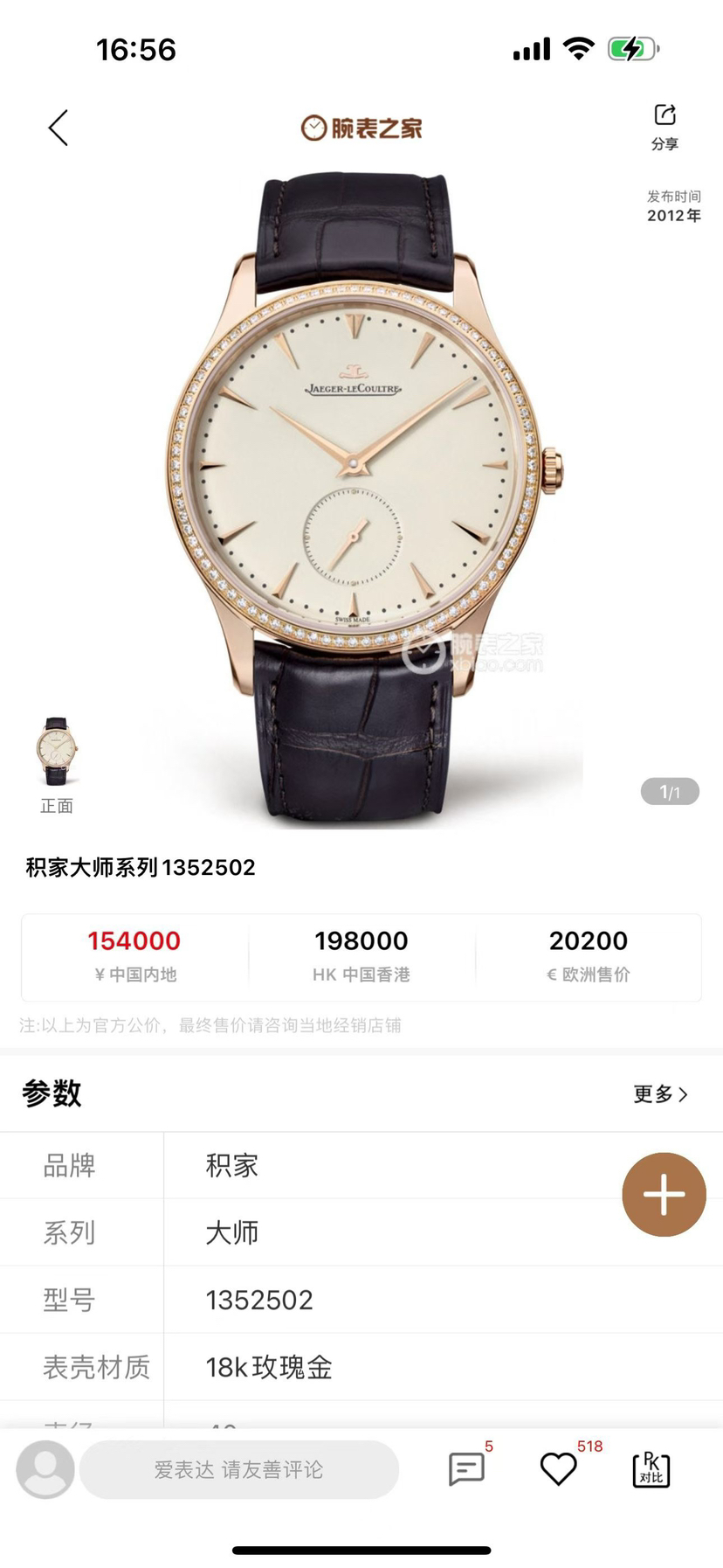 积家大师系列1352502男士机械表 40表盘 玫瑰金原钻 专柜售价154000 现货好价出