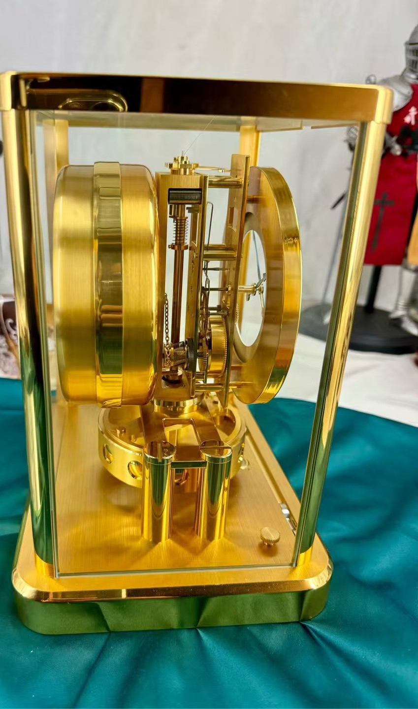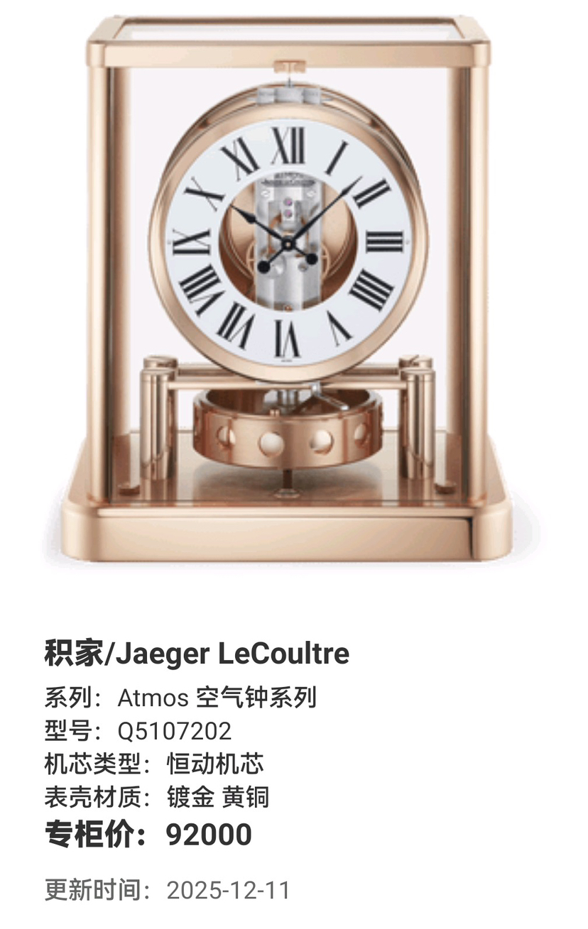 国行当天卡 积家ATMOS空气钟Q5107202优雅隽永的表盘记录着小时、月份和月相变化。经典月相空气钟搭配玫瑰金钟壳,成为室内装饰的点睛之作。摆在家里旁边放个瓶子,就是寓意终生平安,放大象就是寓意终生吉祥[偷笑] 无需电池靠室内温度变化驱动 可使用600年。