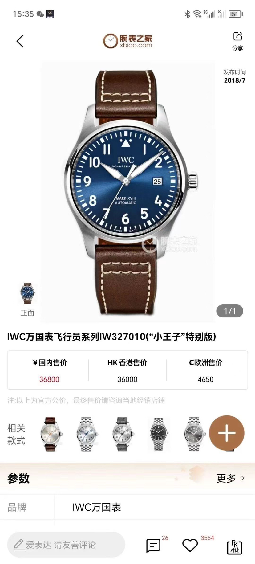 万国飞行员系列IW327010 自动机械 马克18小王子特别款 表径40mm 最美蓝盘 专柜售价36800 现货好价1xxxx
