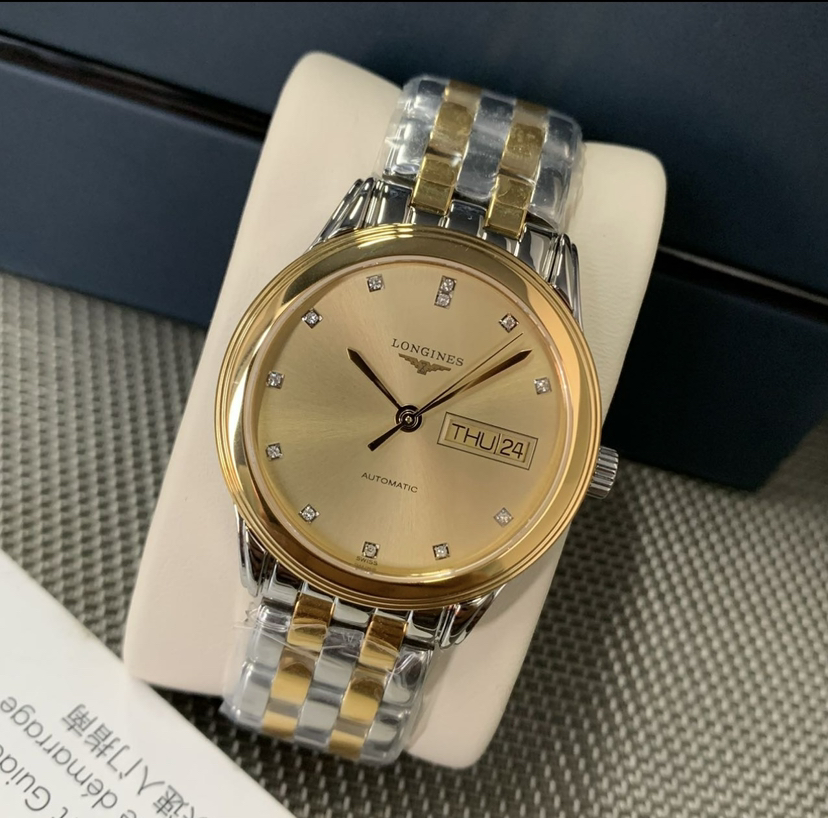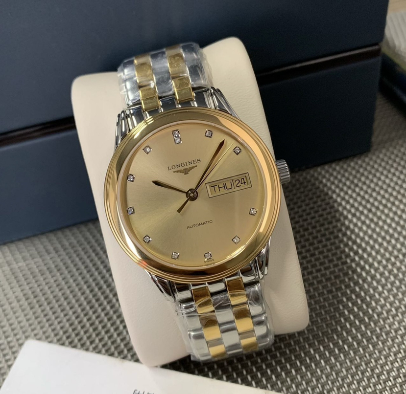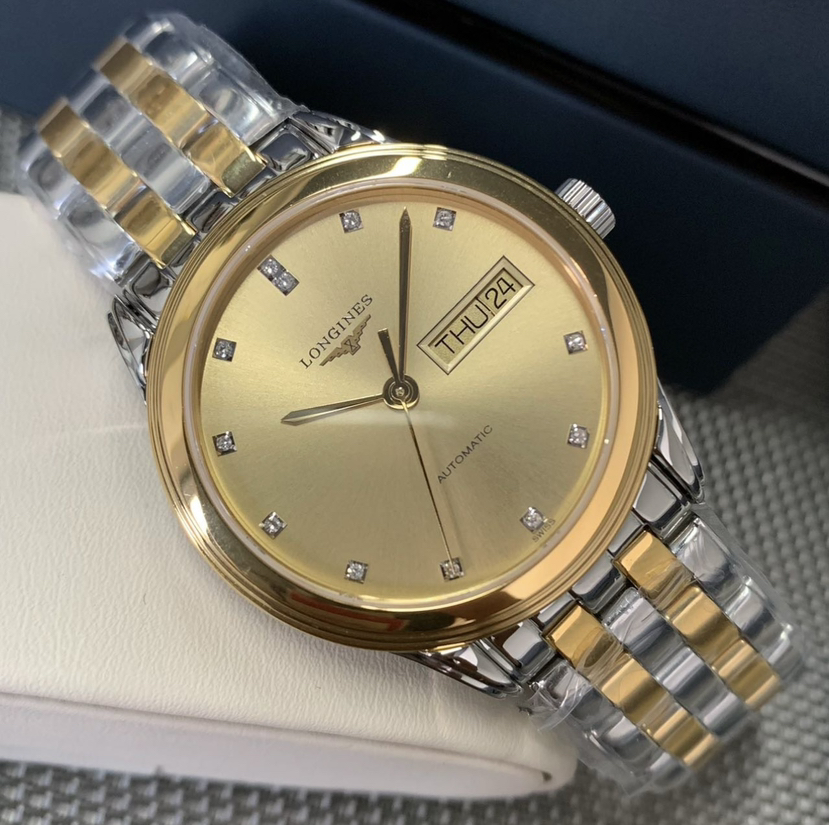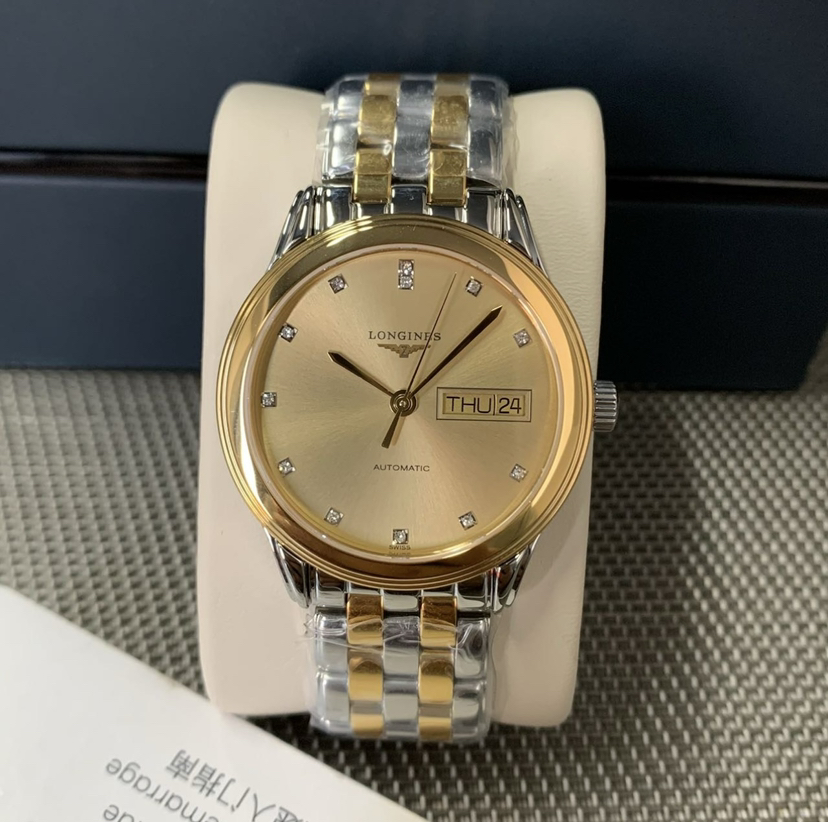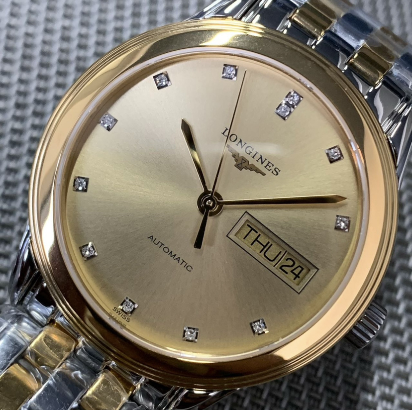 浪琴军旗系列 L4.799.3.37.7 男士自动机械腕表 表径:35.6mm 材质:精钢/镀金 金色盘面 钻石刻度 双日期显示,极品成色,单表,公价17000,现货好价。