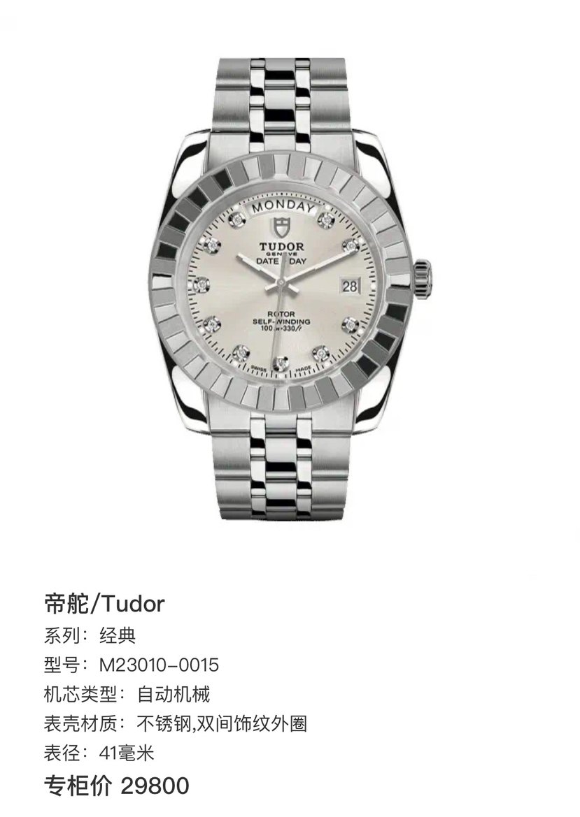 帝舵/Tudor 经典 M23010-0015 自动机械 不锈钢,双间饰纹外圈 41毫米 专柜价29800