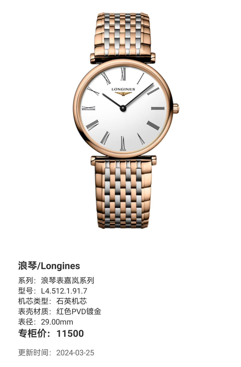 浪琴/Longines 浪琴表嘉岚系列 L4.512.1.91.7 女士腕表,石英机芯 红色PVD镀金 表经29mm 单表 专柜价11500 现货好价