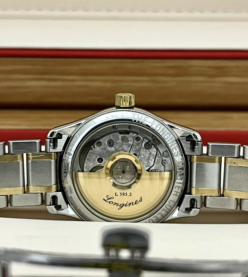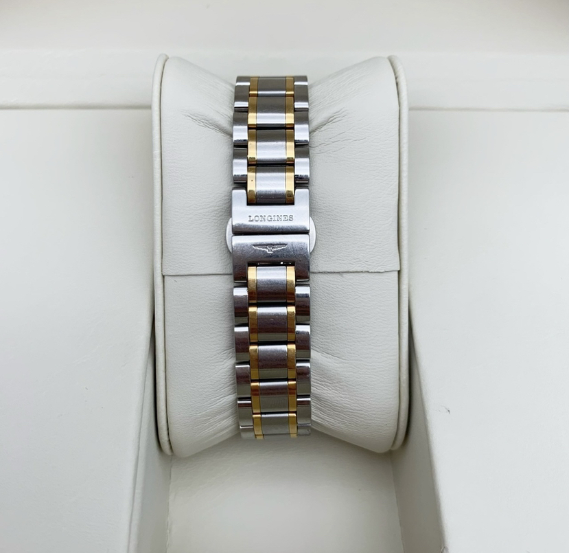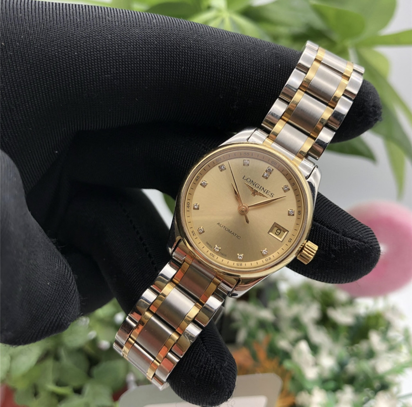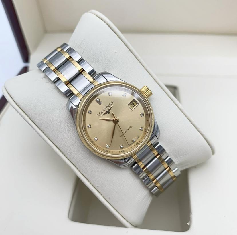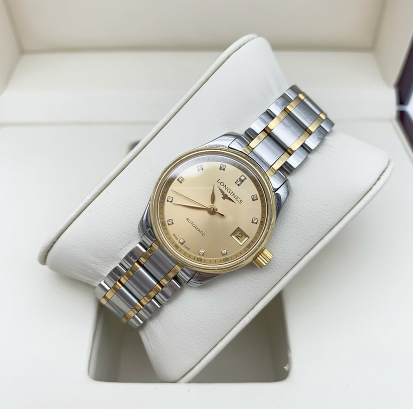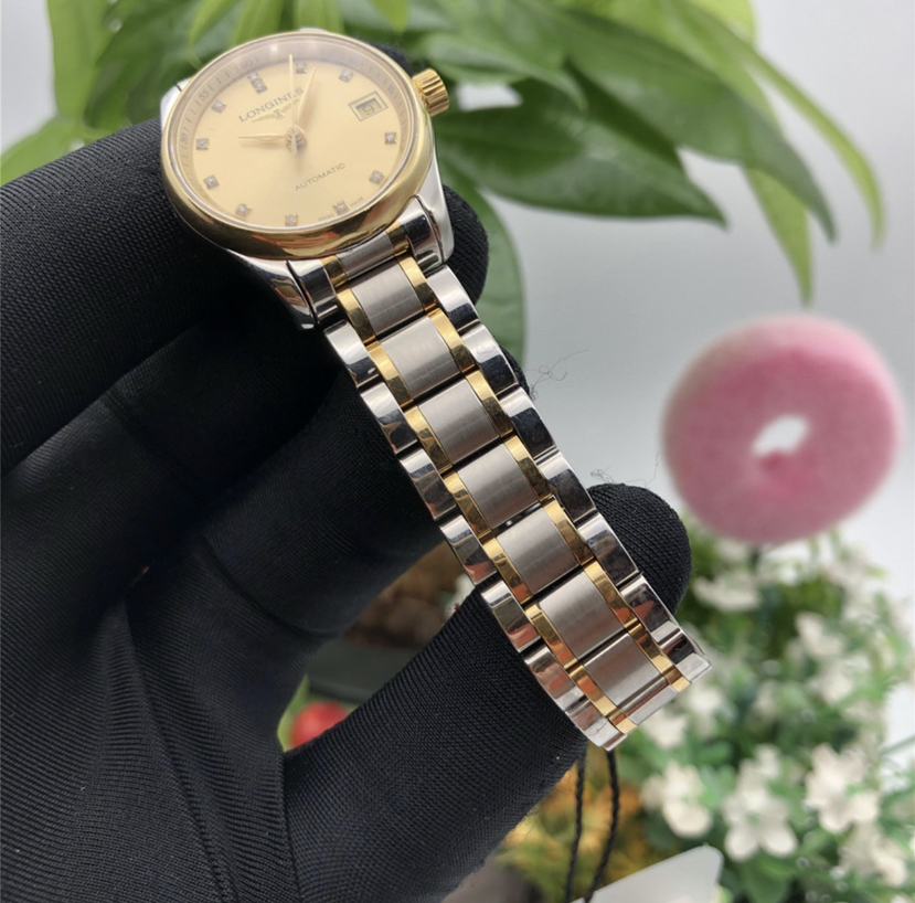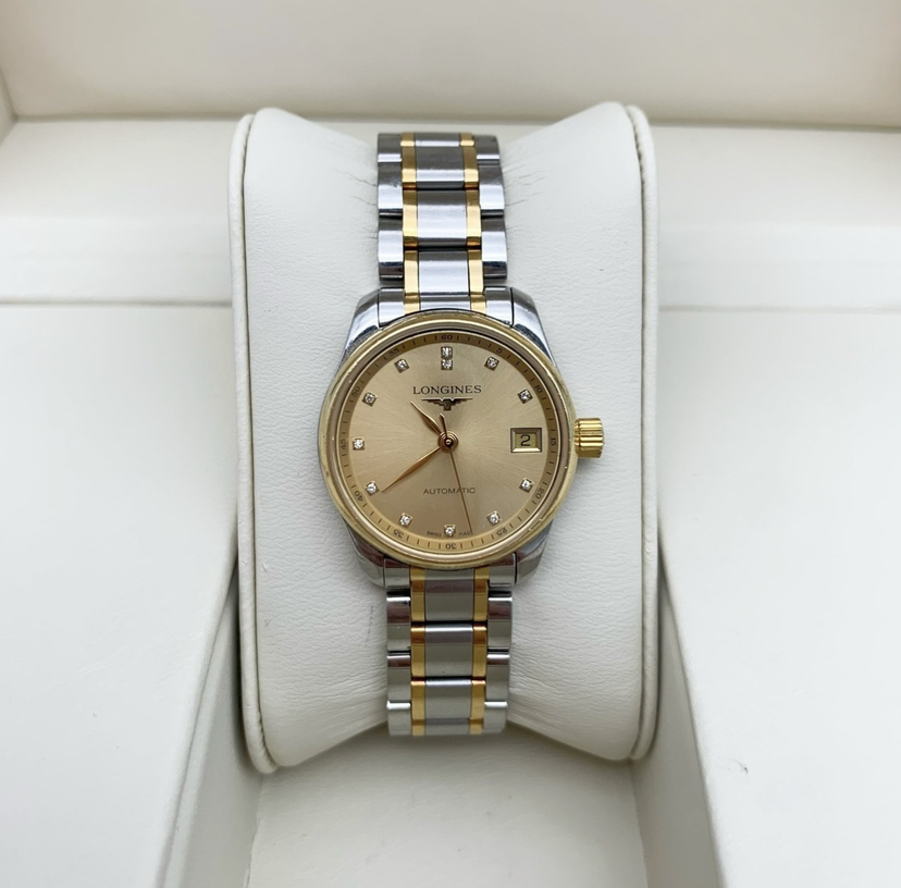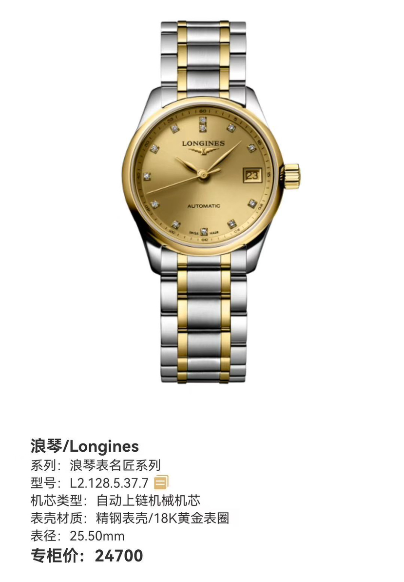 浪琴/Longines 名匠系列,型号L2.128.5.37.7,女士自动机械表,表径25.5mm,香槟色表盘,刻度镶嵌钻石时标,18k金间金表带,21年保卡,公价24700,现货好价