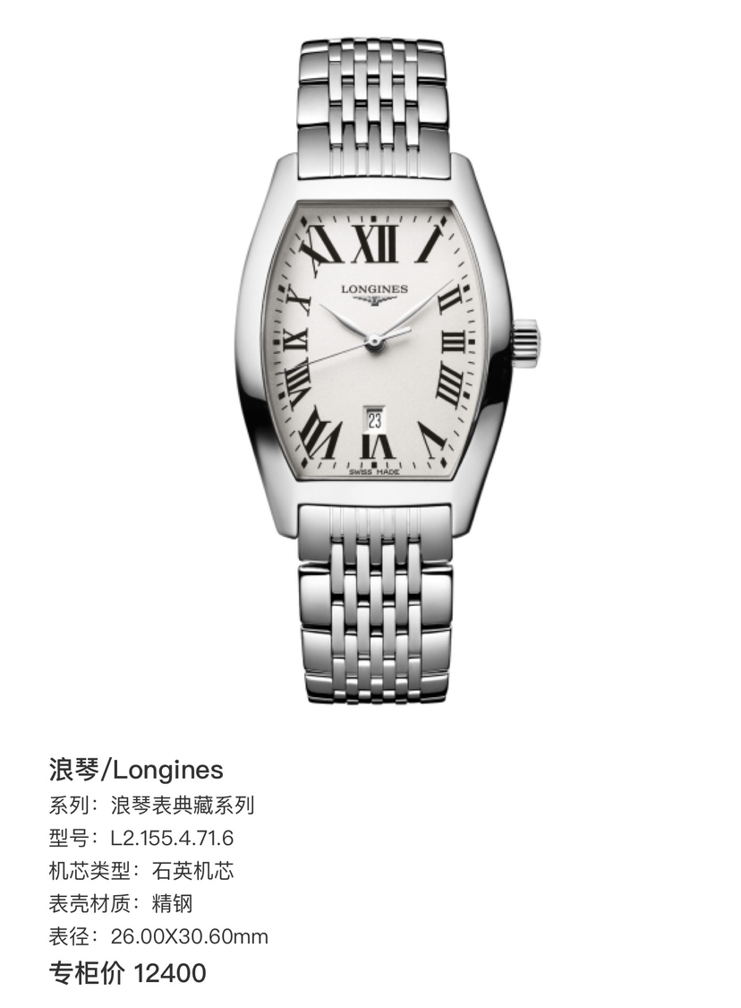 浪琴/Longines 典藏系列 L2.155.4.71.6 石英机芯 26.00X30.60mm 公价12400。