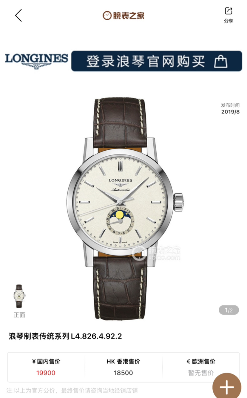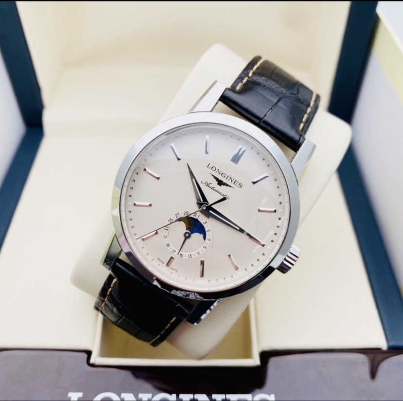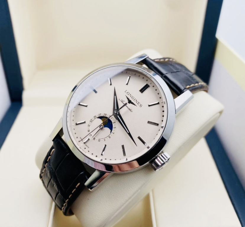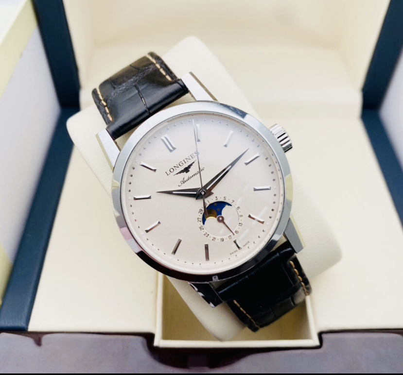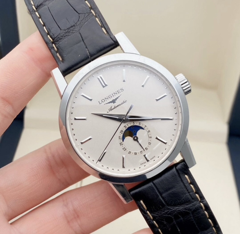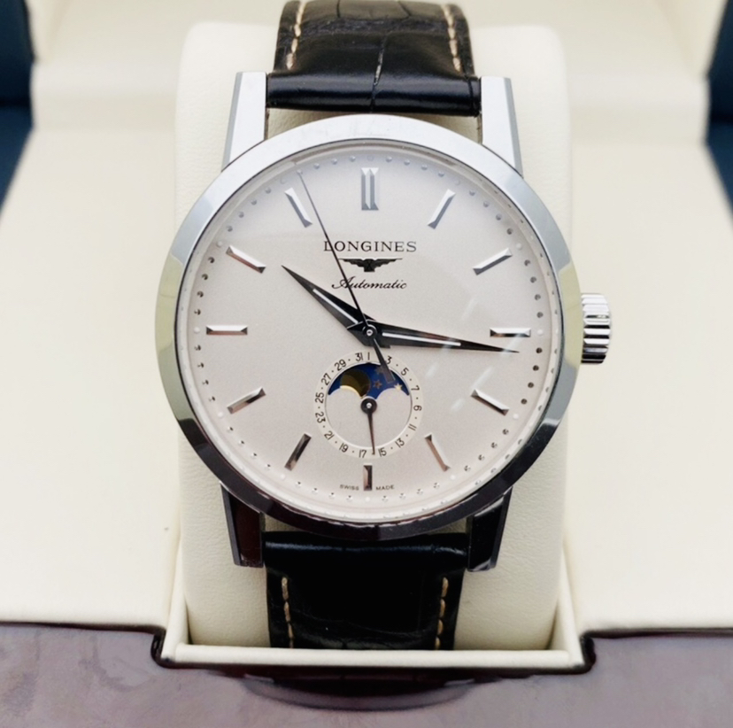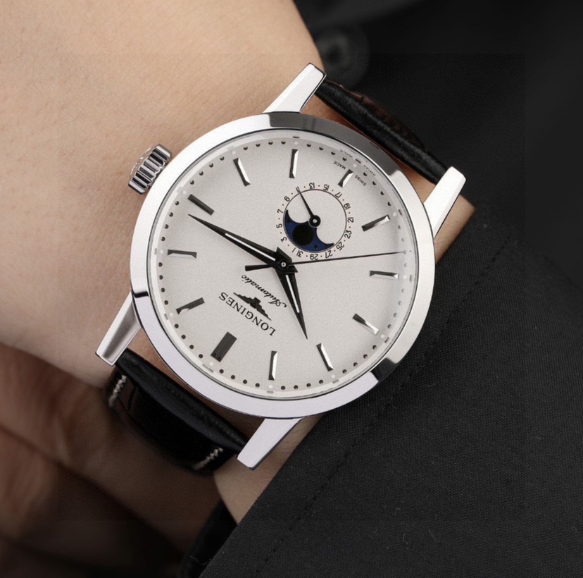 浪琴L4.826.4.92.2最新款经典复刻系列男士机械腕表,简约条针颗粒盘面、日期及月相功能,表径40MM,极品成色,23年保卡,后配全新表带,原价19000 现货好价