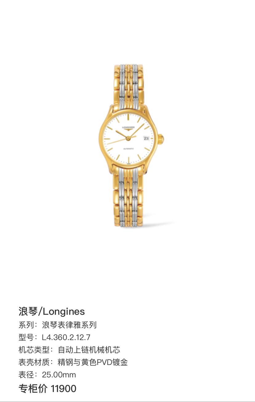 浪琴/Longines 浪琴表律雅系列 L4.360.2.12.7 自动上链机械机芯 精钢与黄色PVD镀金 25.00mm 专柜价 11900。