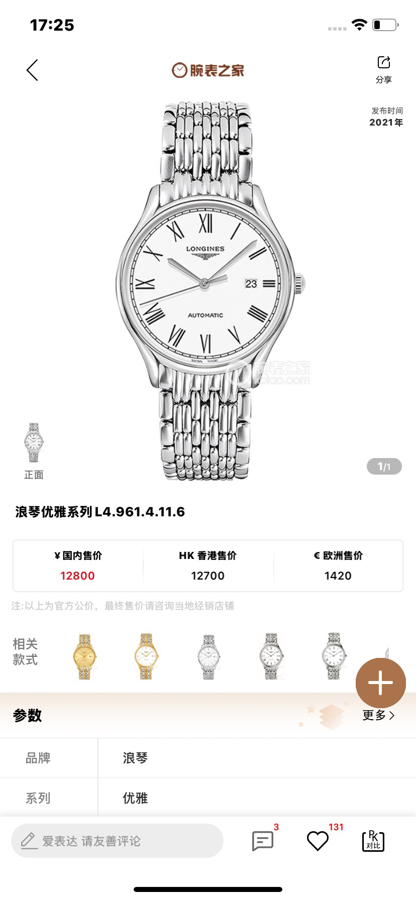 浪琴/Longines 浪琴表律雅系列 L4.961.4.11.6 自动上链机械机芯 精钢 40.00mm 专柜价12800。