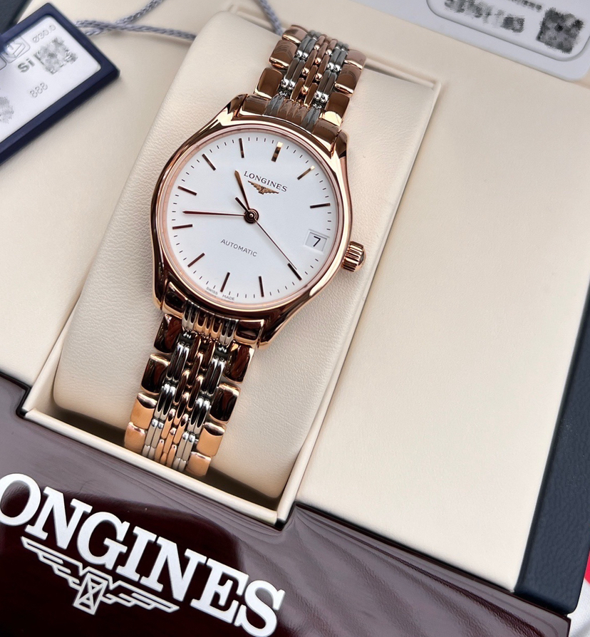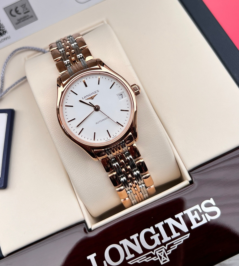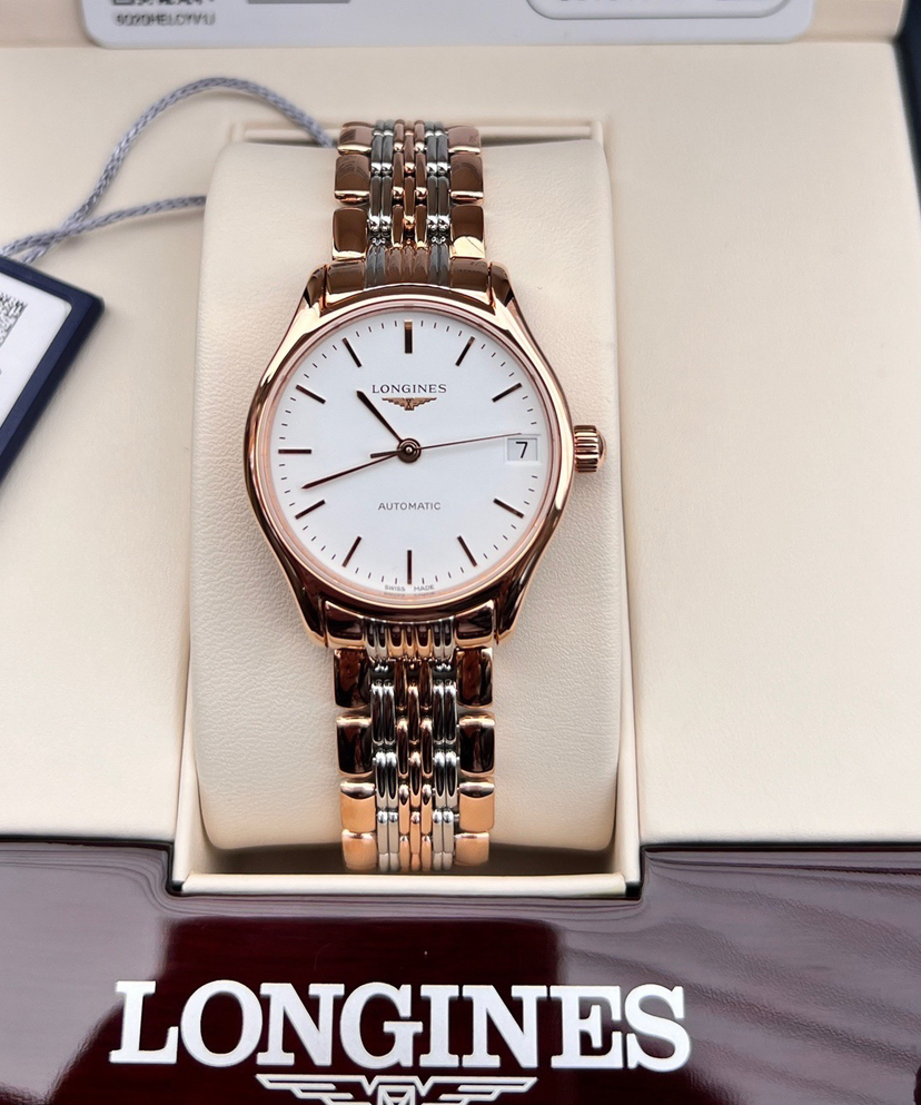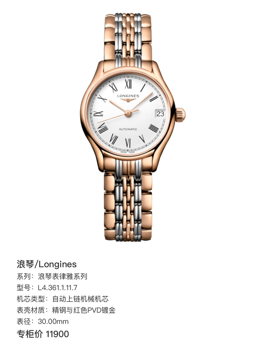 浪琴/Longines 浪琴表律雅系列 L4.361.1.11.7 自动上链机械机芯 精钢与红色PVD镀金 30.00mm 专柜价11900。