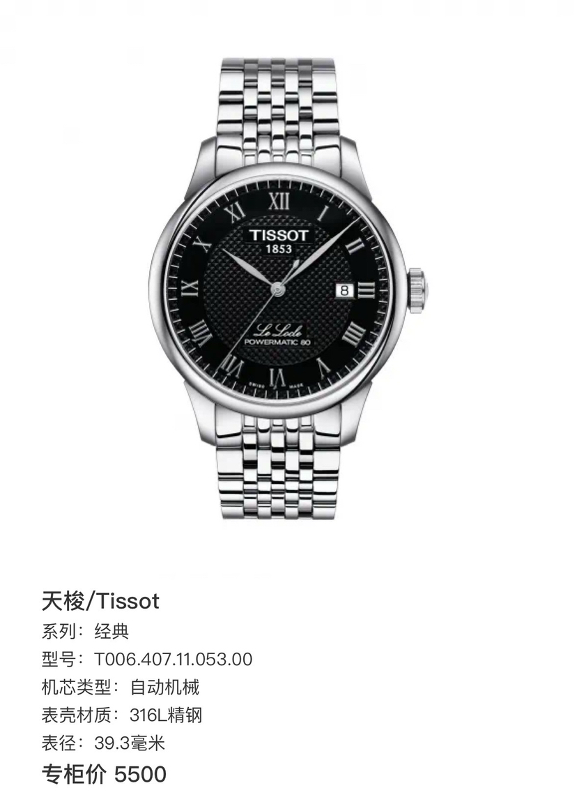 天梭 经典 T006.407.11.053.00 自动机械 316L精钢 39.3mm表径 专柜价5500 单表好价。
