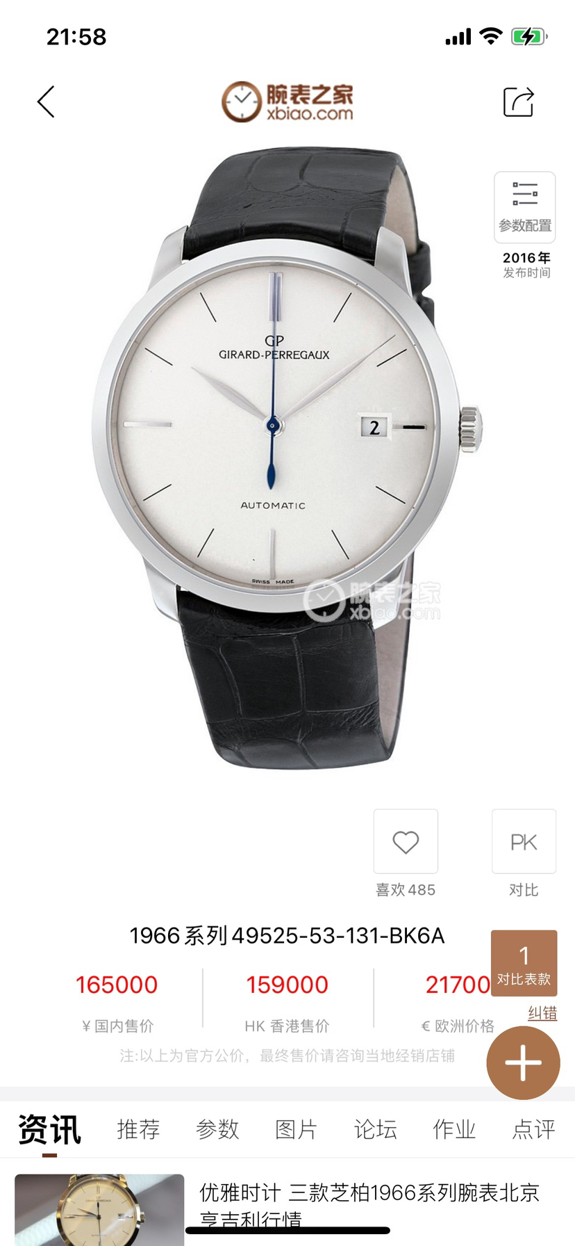 芝柏/Girard-Perregaux 1966 自动机械 18K白金 38毫米 专柜价 165000 单表