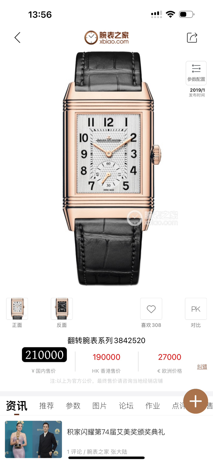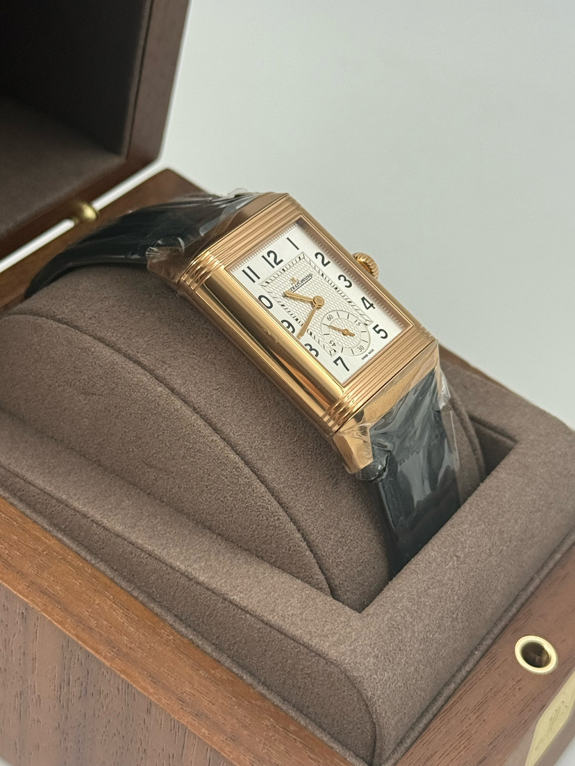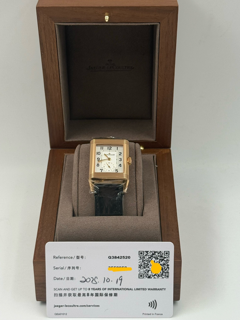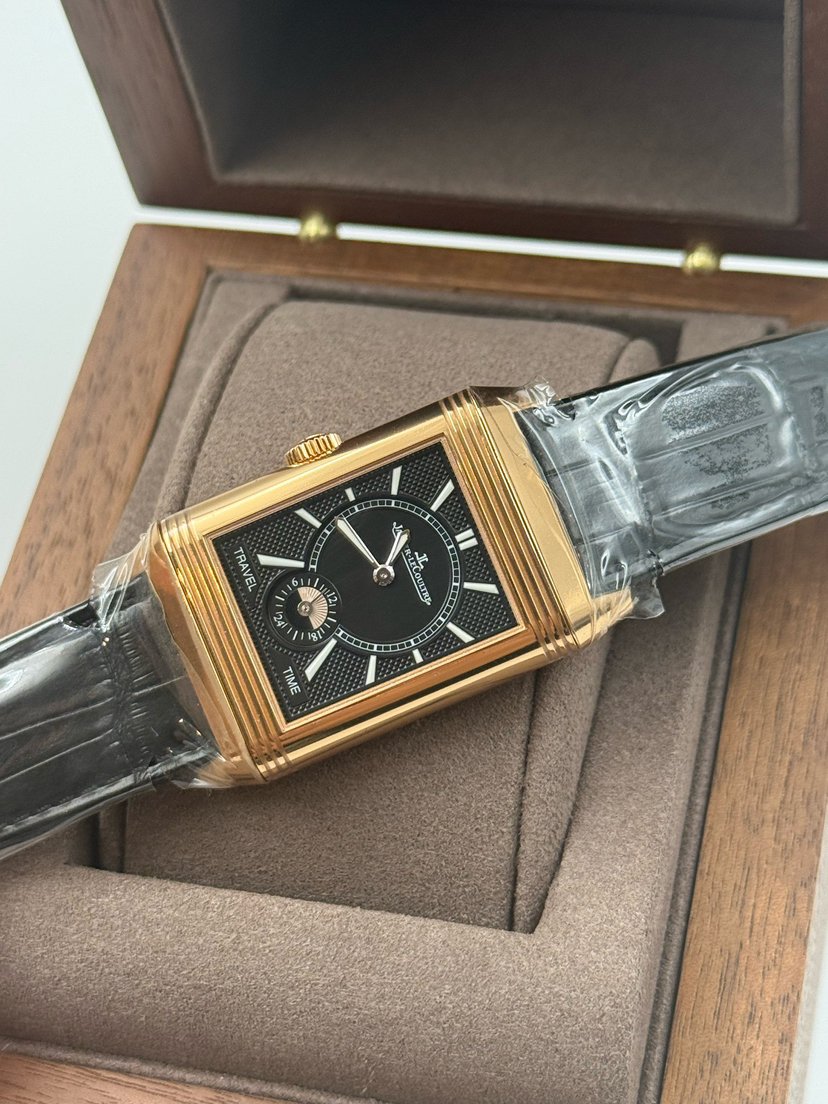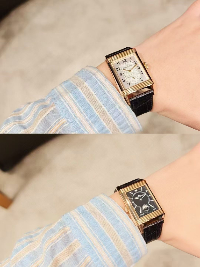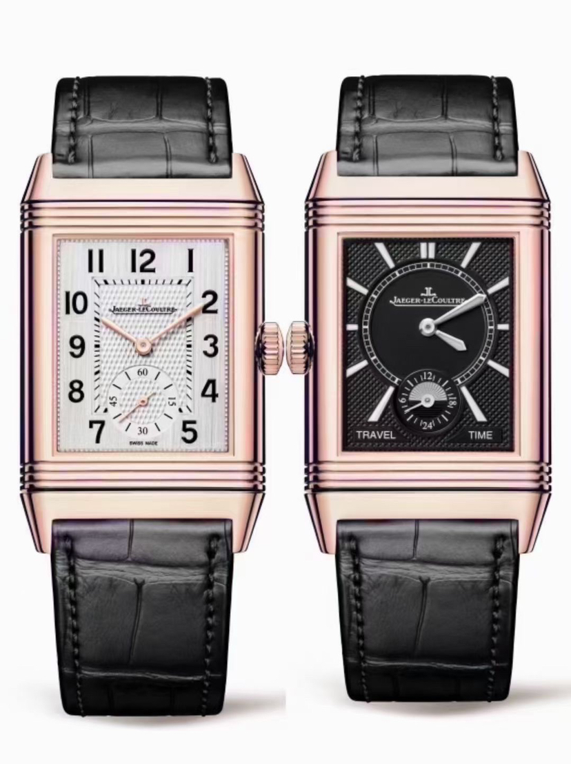 未使用全套近期卡,积家翻转系列Q3842520 黑白双面,18K玫瑰金材质,表径47x28mm,小三针显示,GMT两地时功能,手动机械,公价 210000