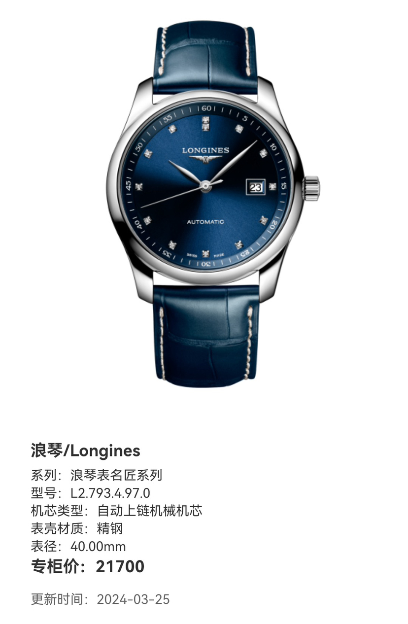 浪琴/Longines 浪琴表名匠系列 L2.793.4.97.0 自动上链机械机芯 精钢 40.00mm 专柜价21700